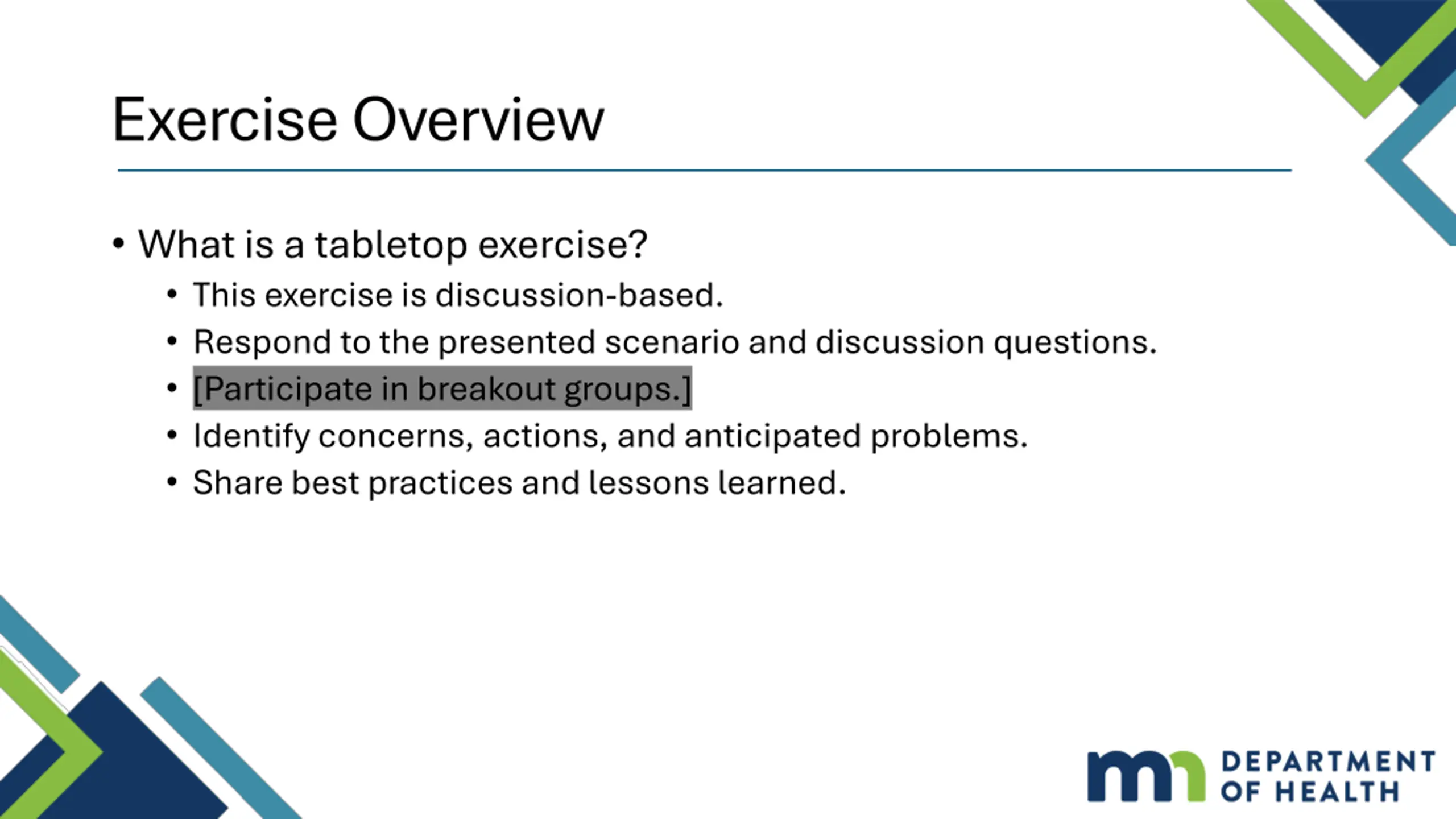 Exercise Overview What is a tabletop exercise? This exercise is discussion-based. Respond to the presented scenario and discussion questions. [Participate in breakout groups.] Identify concerns, actions, and anticipated problems. Share best practices and lessons learned.