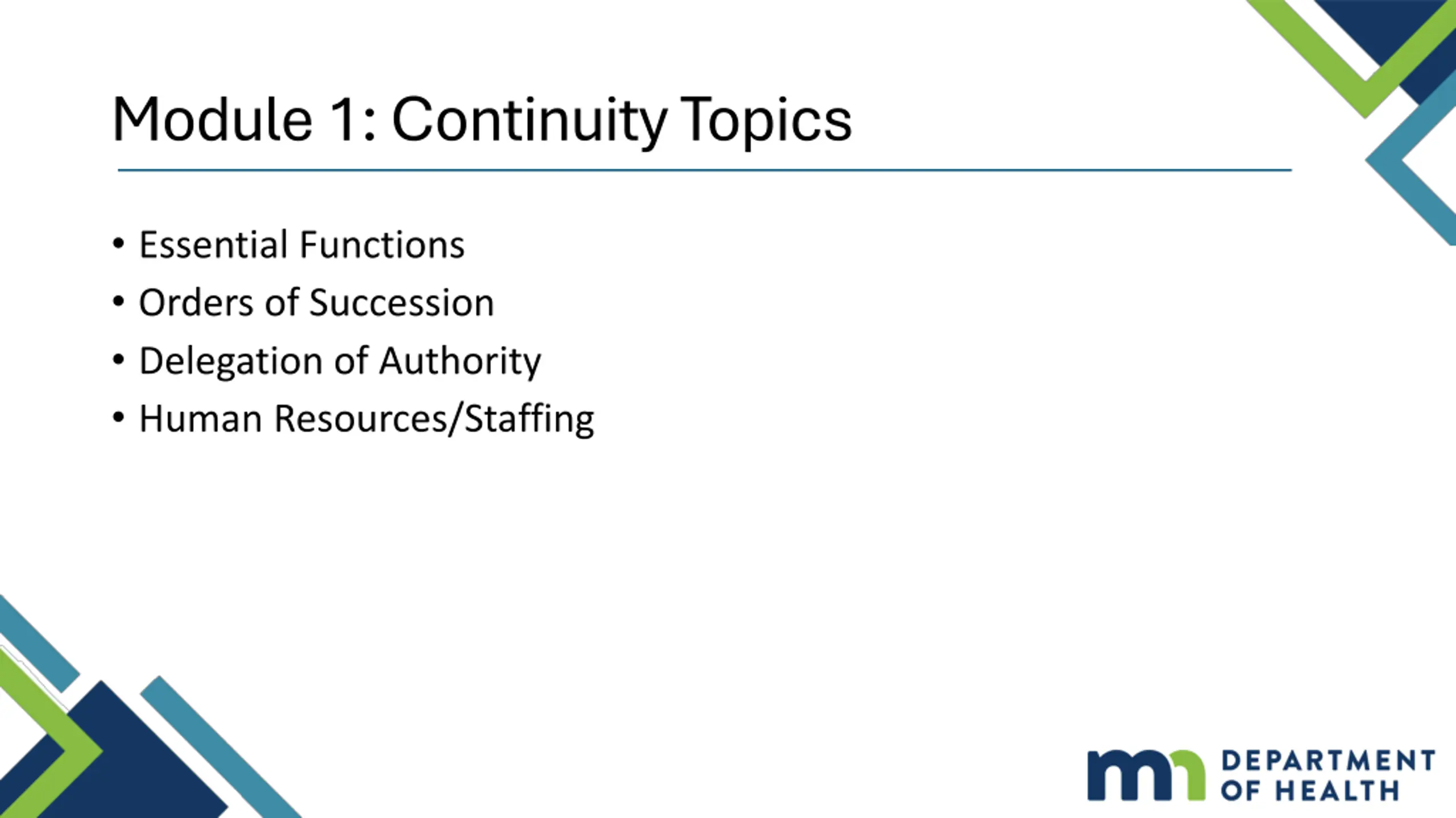 Module 1: Continuity Topics Essential Functions Orders of Succession Delegation of Authority Human Resources/Staffing
