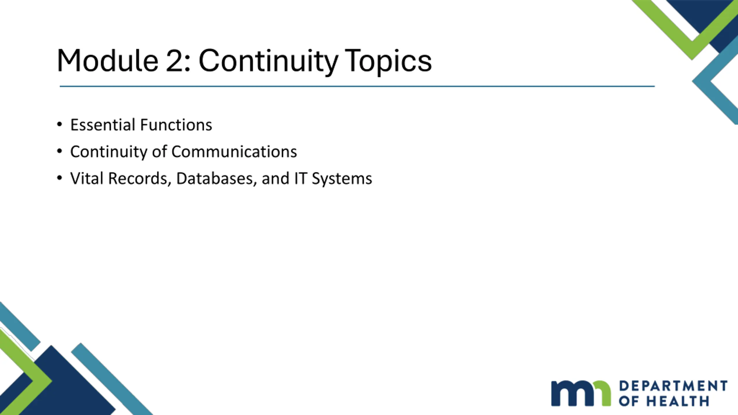 Module 2: Continuity Topics Essential Functions Continuity of Communications Vital Records, Databases, and IT Systems