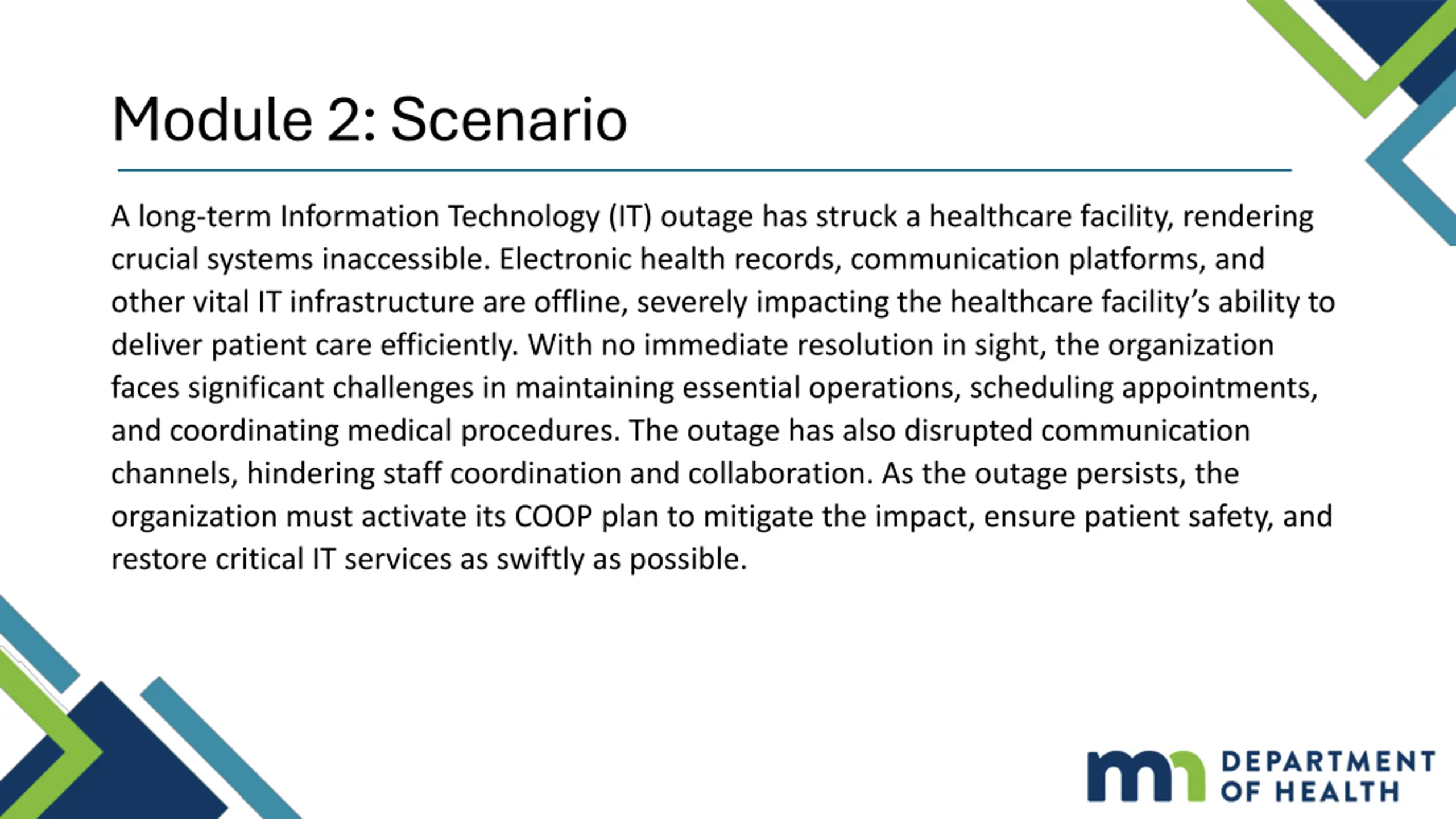 Module 2: Scenario A long-term Information Technology (IT) outage has struck a healthcare facility, rendering crucial systems inaccessible. Electronic health records, communication platforms, and other vital IT infrastructure are offline, severely impacting the healthcare facility s ability to deliver patient care efficiently. With no immediate resolution in sight, the organization faces significant challenges in maintaining essential operations, scheduling appointments, and coordinating medical procedures. The outage has also disrupted communication channels, hindering staff coordination and collaboration. As the outage persists, the organization must activate its COOP plan to mitigate the impact, ensure patient safety, and restore critical IT services as swiftly as possible.