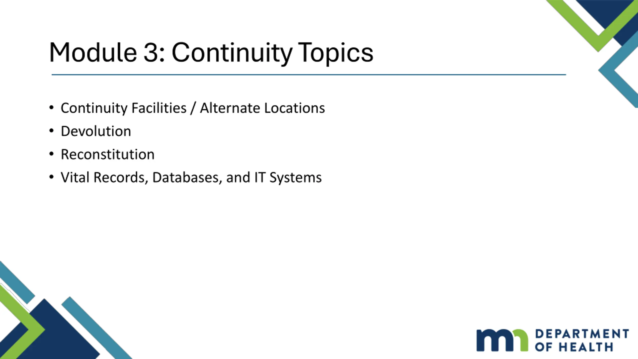 Module 3: Continuity Topics Continuity Facilities / Alternate Locations Devolution Reconstitution Vital Records, Databases, and IT Systems