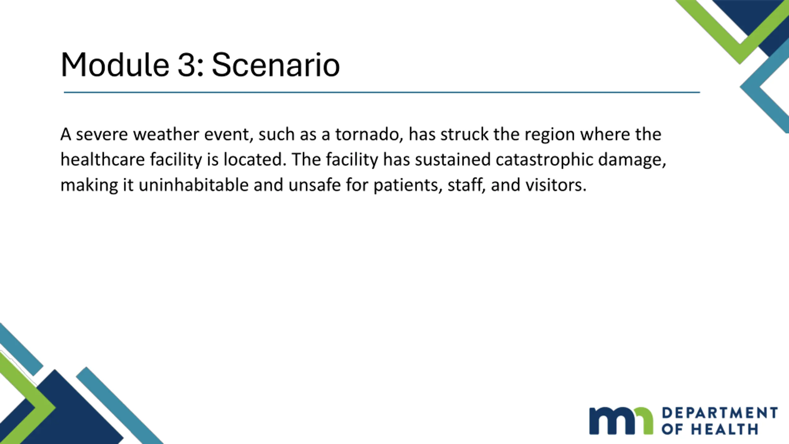 Module 3: Scenario A severe weather event, such as a tornado, has struck the region where the healthcare facility is located. The facility has sustained catastrophic damage, making it uninhabitable and unsafe for patients, staff, and visitors.