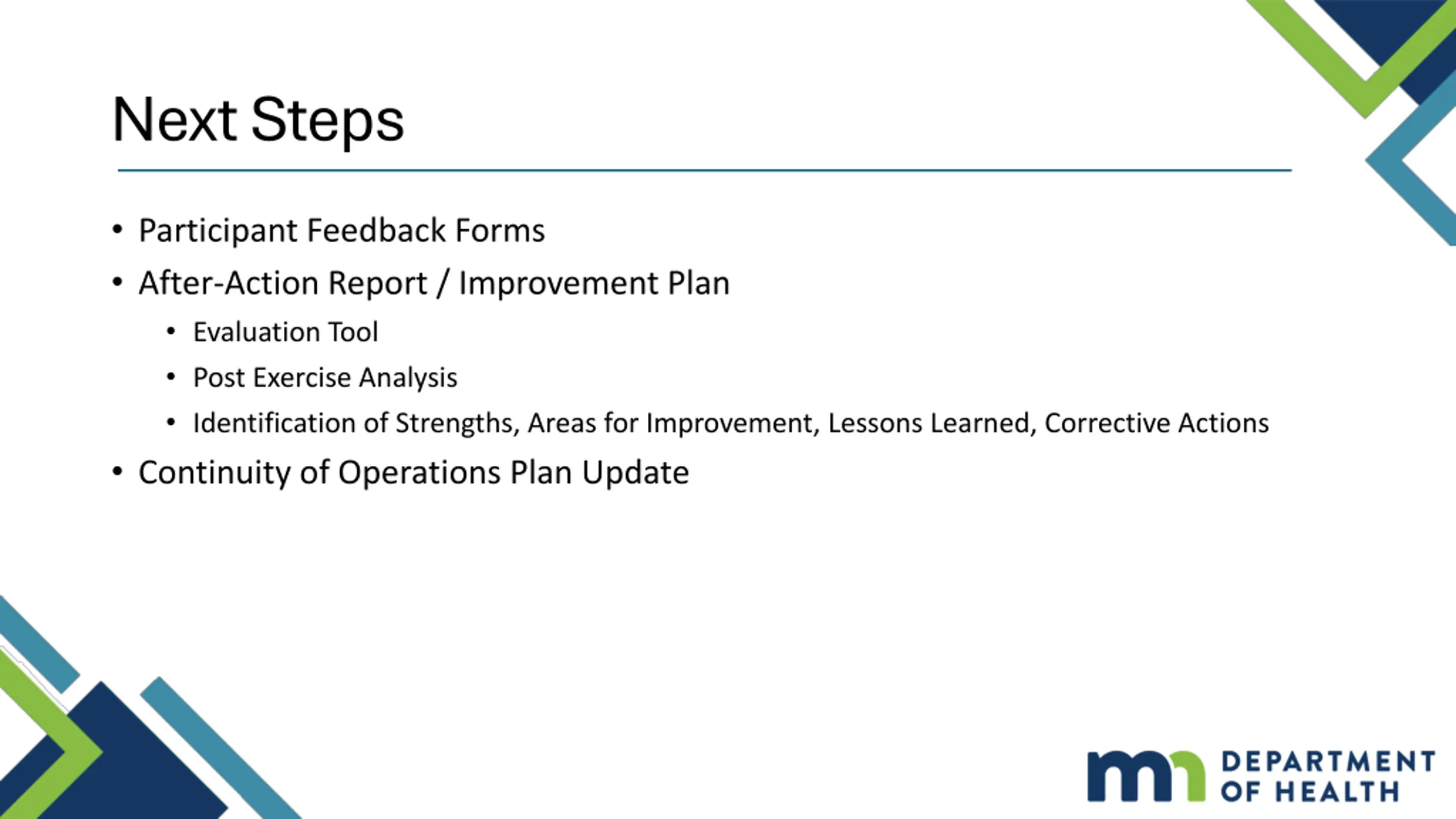 Next Steps Participant Feedback Forms After-Action Report / Improvement Plan Evaluation Tool Post Exercise Analysis Identification of Strengths, Areas for Improvement, Lessons Learned, Corrective Actions Continuity of Operations Plan Update