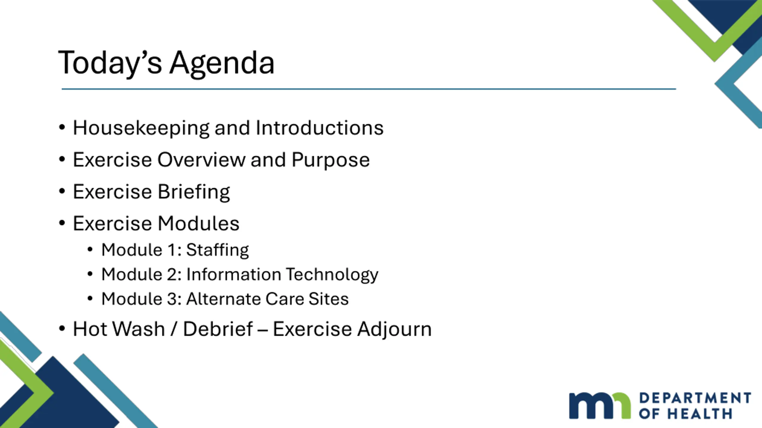 Todays Agenda Housekeeping and Introductions Exercise Overview and Purpose Exercise Briefing Exercise Modules Module 1: Staffing Module 2: Information Technology Module 3: Alternate Care Sites Hot Wash / Debrief Exercise Adjourn