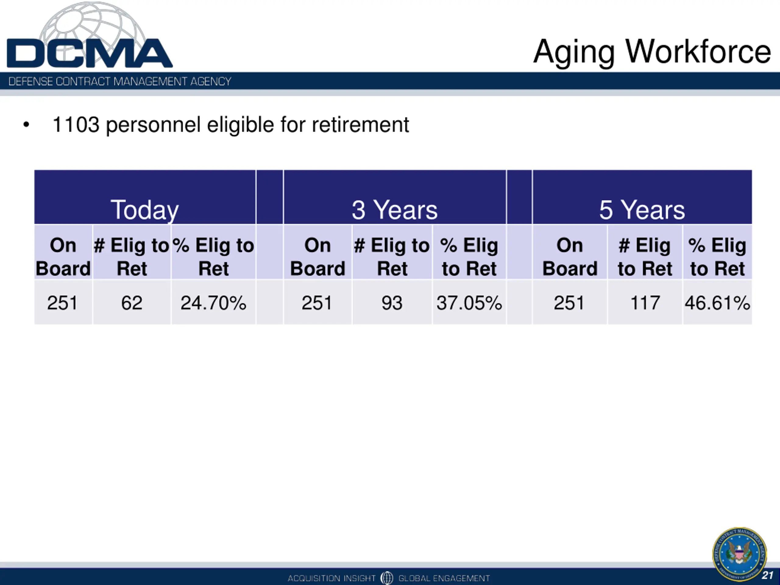 Aging Workforce 1103 personnel eligible for retirement Today # Elig to Ret 3 Years # Elig to Ret 5 Years # Elig to Ret On Board % Elig to Ret On Board % Elig to Ret On Board % Elig to Ret 251 62 24.70% 251 93 37.05% 251 117 46.61% 21