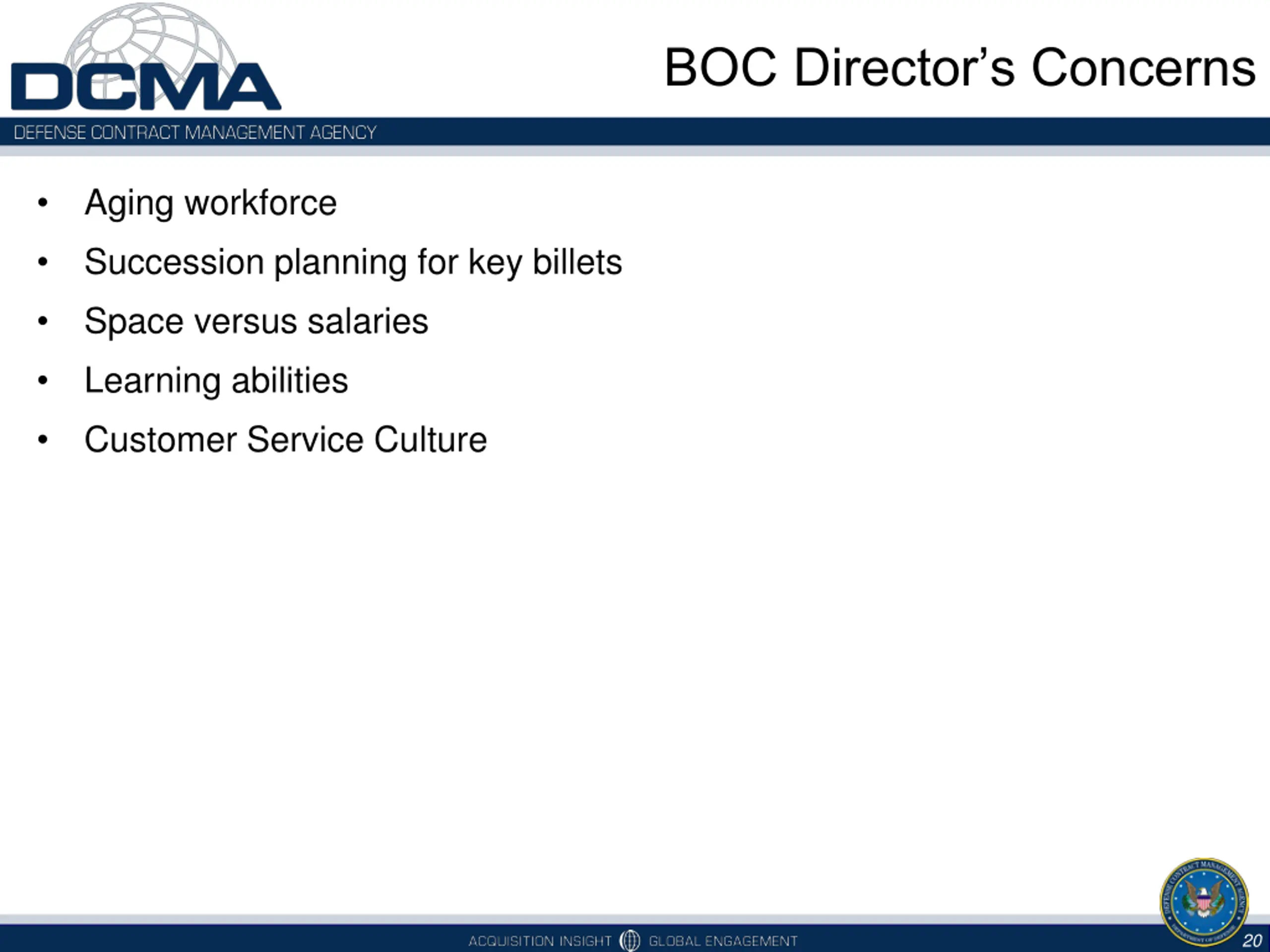 BOC Directors Concerns Aging workforce Succession planning for key billets Space versus salaries Learning abilities Customer Service Culture 20