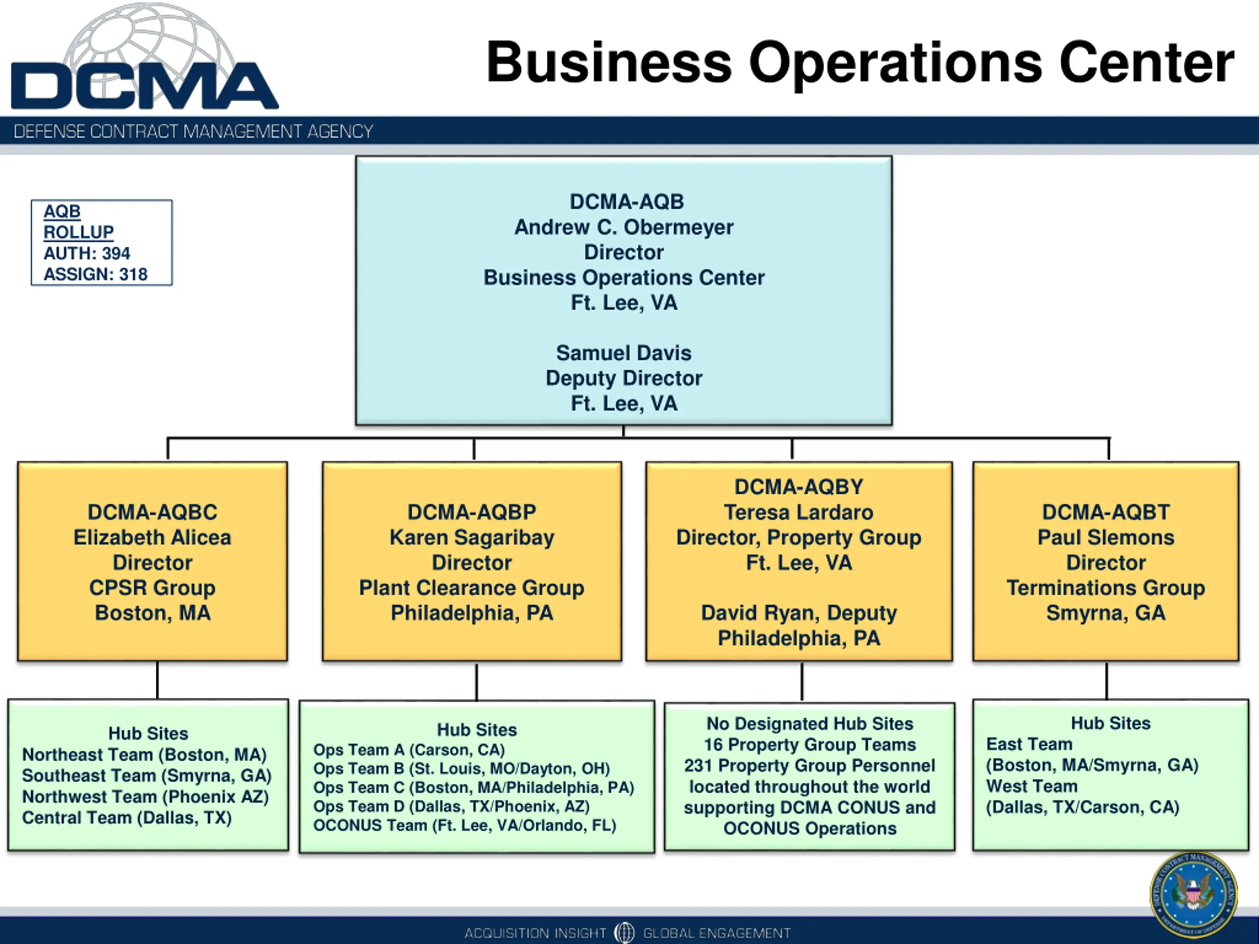 Business Operations Center DCMA-AQB Andrew C. Obermeyer Director Business Operations Center Ft. Lee, VA AQB ROLLUP AUTH: 394 ASSIGN: 318 Samuel Davis Deputy Director Ft. Lee, VA DCMA-AQBY Teresa Lardaro Director, Property Group Ft. Lee, VA DCMA-AQBC Elizabeth Alicea Director CPSR Group Boston, MA DCMA-AQBP Karen Sagaribay Director Plant Clearance Group Philadelphia, PA DCMA-AQBT Paul Slemons Director Terminations Group Smyrna, GA David Ryan, Deputy Philadelphia, PA Hub Sites No Designated Hub Sites 16 Property Group Teams 231 Property Group Personnel located throughout the world supporting DCMA CONUS and OCONUS Operations Hub Sites Hub Sites East Team (Boston, MA/Smyrna, GA) West Team (Dallas, TX/Carson, CA) Ops Team A (Carson, CA) Ops Team B (St. Louis, MO/Dayton, OH) Ops Team C (Boston, MA/Philadelphia, PA) Ops Team D (Dallas, TX/Phoenix, AZ) OCONUS Team (Ft. Lee, VA/Orlando, FL) Northeast Team (Boston, MA) Southeast Team (Smyrna, GA) Northwest Team (Phoenix AZ) Central Team (Dallas, TX)