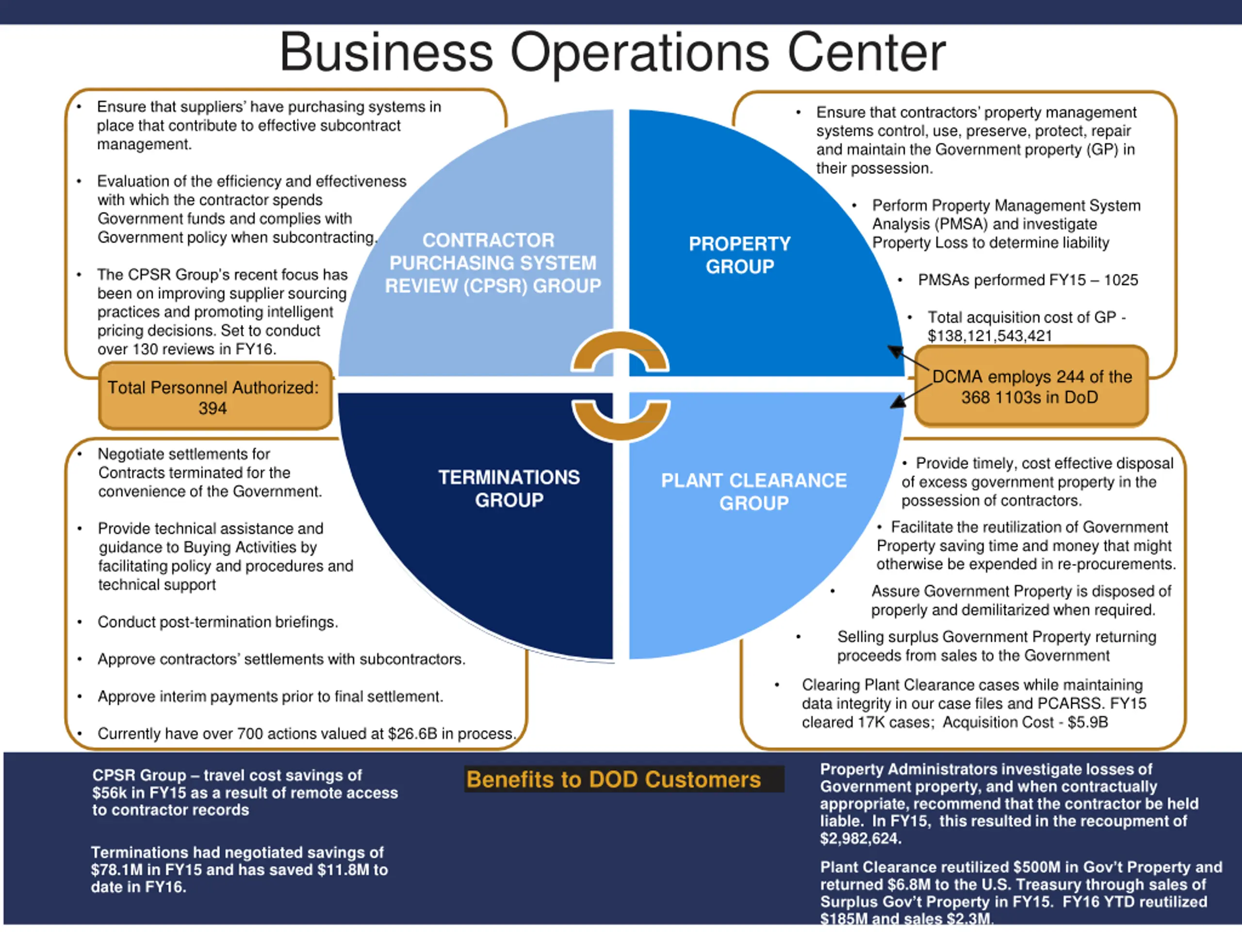Business Operations Center Ensure that suppliers have purchasing systems in place that contribute to effective subcontract management. Ensure that contractors property management systems control, use, preserve, protect, repair and maintain the Government property (GP) in their possession. Evaluation of the efficiency and effectiveness with which the contractor spends Government funds and complies with Government policy when subcontracting. Perform Property Management System Analysis (PMSA) and investigate Property Loss to determine liability CONTRACTOR PURCHASING SYSTEM REVIEW (CPSR) GROUP PROPERTY GROUP been on improving supplier sourcing practices and promoting intelligent pricing decisions. Set to conduct over 130 reviews in FY16. The CPSR Group s recent focus has PMSAs performed FY15 1025 Total acquisition cost of GP - $138,121,543,421 DCMA employs 244 of the 368 1103s in DoD Total Personnel Authorized: 394 Negotiate settlements for Contracts terminated for the convenience of the Government. Provide timely, cost effective disposal of excess government property in the possession of contractors. TERMINATIONS GROUP PLANT CLEARANCE GROUP Facilitate the reutilization of Government Property saving time and money that might otherwise be expended in re-procurements. Provide technical assistance and guidance to Buying Activities by facilitating policy and procedures and technical support Assure Government Property is disposed of properly and demilitarized when required. Conduct post-termination briefings. Selling surplus Government Property returning proceeds from sales to the Government Approve contractors settlements with subcontractors. Clearing Plant Clearance cases while maintaining data integrity in our case files and PCARSS. FY15 cleared 17K cases; Acquisition Cost - $5.9B Approve interim payments prior to final settlement. Currently have over 700 actions valued at $26.6B in process. Property Administrators investigate losses of Government property, and when contractually appropriate, recommend that the contractor be held liable. In FY15, this resulted in the recoupment of $2,982,624. CPSR Group travel cost savings of $56k in FY15 as a result of remote access to contractor records Benefits to DOD Customers Terminations had negotiated savings of $78.1M in FY15 and has saved $11.8M to date in FY16. Plant Clearance reutilized $500M in Gov t Property and returned $6.8M to the U.S. Treasury through sales of Surplus Gov t Property in FY15. FY16 YTD reutilized $185M and sales $2.3M.