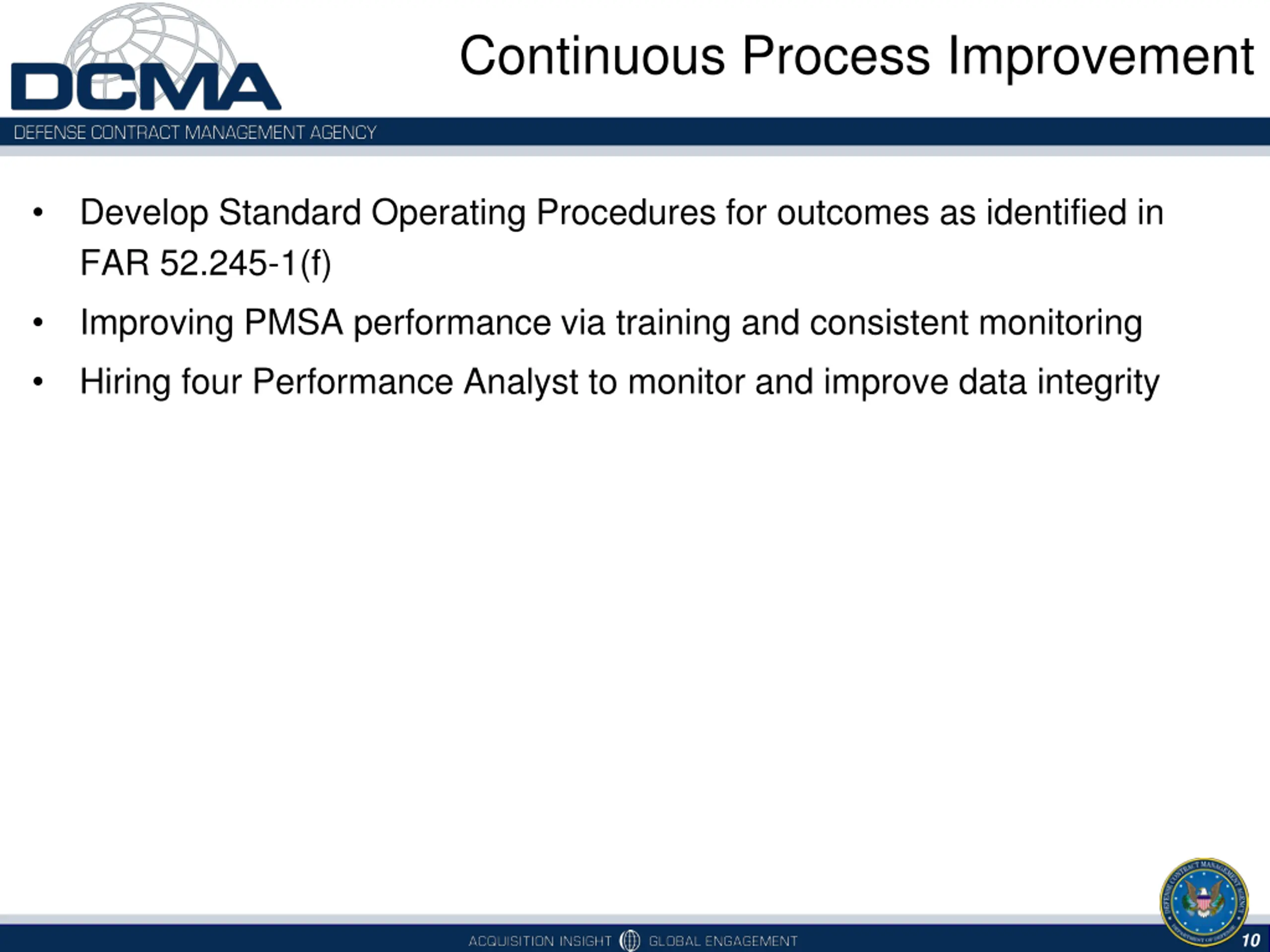 Continuous Process Improvement Develop Standard Operating Procedures for outcomes as identified in FAR 52.245-1(f) Improving PMSA performance via training and consistent monitoring Hiring four Performance Analyst to monitor and improve data integrity 10