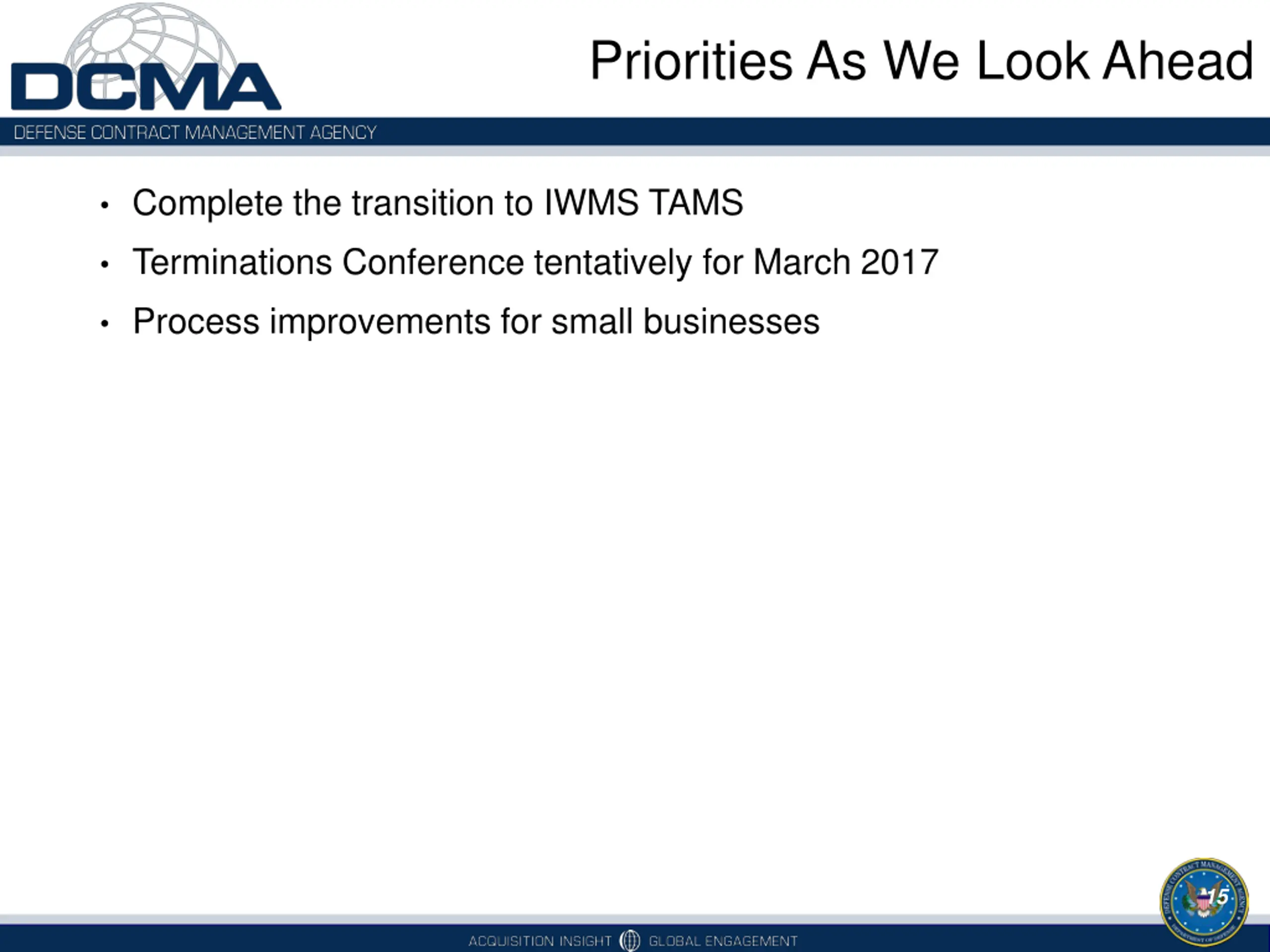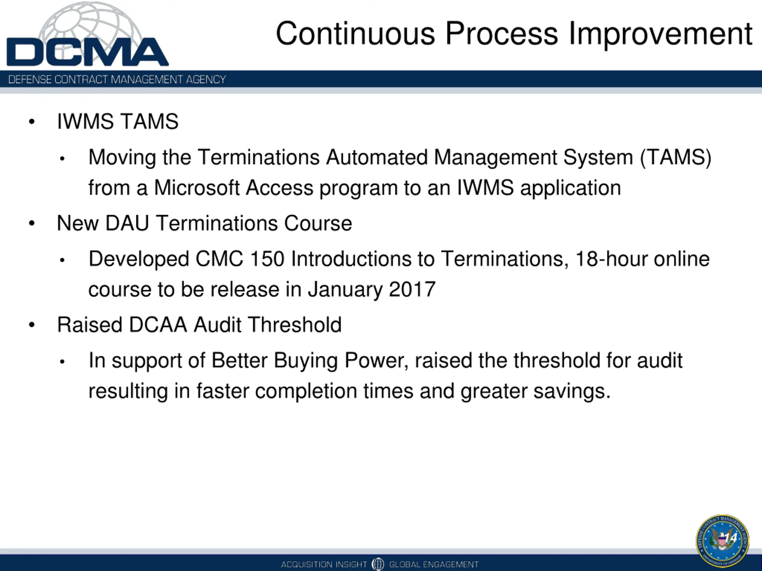 Continuous Process Improvement IWMS TAMS Moving the Terminations Automated Management System (TAMS) from a Microsoft Access program to an IWMS application New DAU Terminations Course Developed CMC 150 Introductions to Terminations, 18-hour online course to be release in January 2017 Raised DCAA Audit Threshold In support of Better Buying Power, raised the threshold for audit resulting in faster completion times and greater savings. 14