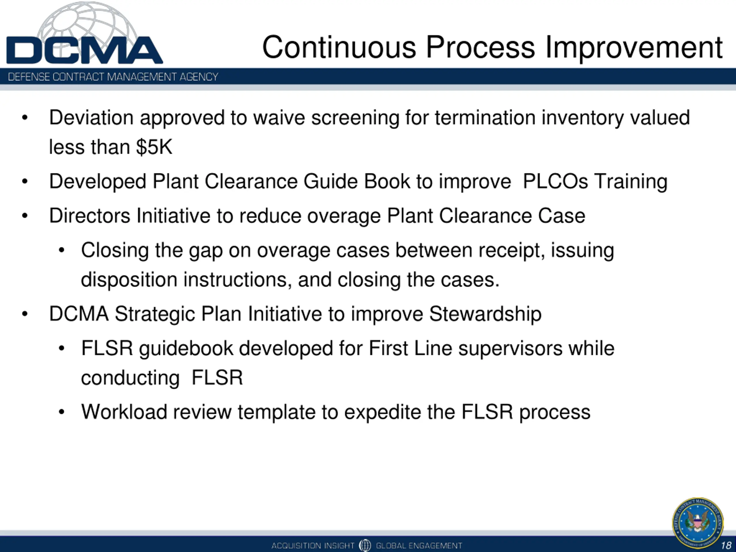 Continuous Process Improvement Deviation approved to waive screening for termination inventory valued less than $5K Developed Plant Clearance Guide Book to improve PLCOs Training Directors Initiative to reduce overage Plant Clearance Case Closing the gap on overage cases between receipt, issuing disposition instructions, and closing the cases. DCMA Strategic Plan Initiative to improve Stewardship FLSR guidebook developed for First Line supervisors while conducting FLSR Workload review template to expedite the FLSR process 18