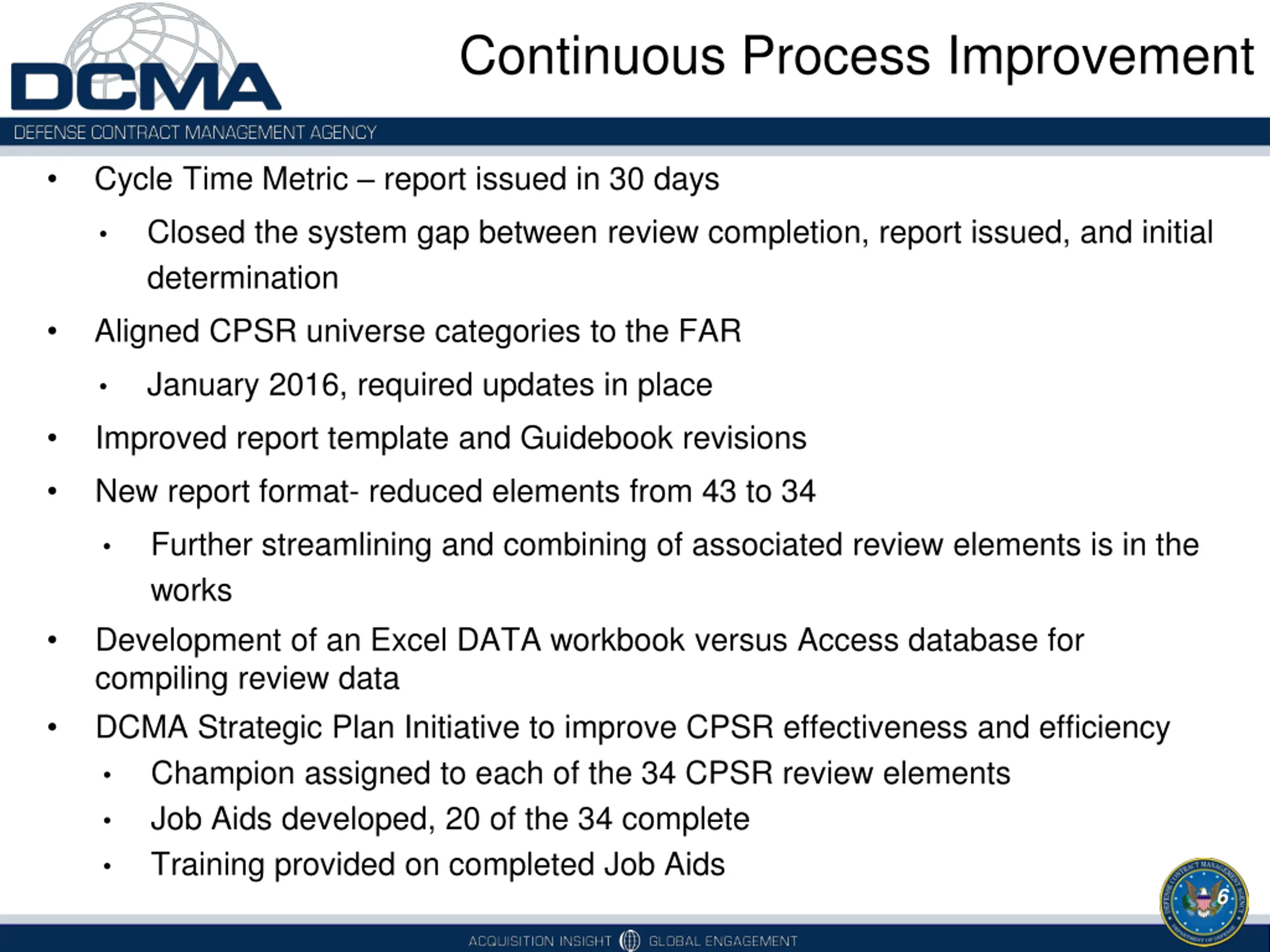 Continuous Process Improvement Cycle Time Metric report issued in 30 days Closed the system gap between review completion, report issued, and initial determination Aligned CPSR universe categories to the FAR January 2016, required updates in place Improved report template and Guidebook revisions New report format- reduced elements from 43 to 34 Further streamlining and combining of associated review elements is in the works Development of an Excel DATA workbook versus Access database for compiling review data DCMA Strategic Plan Initiative to improve CPSR effectiveness and efficiency Champion assigned to each of the 34 CPSR review elements Job Aids developed, 20 of the 34 complete Training provided on completed Job Aids 6