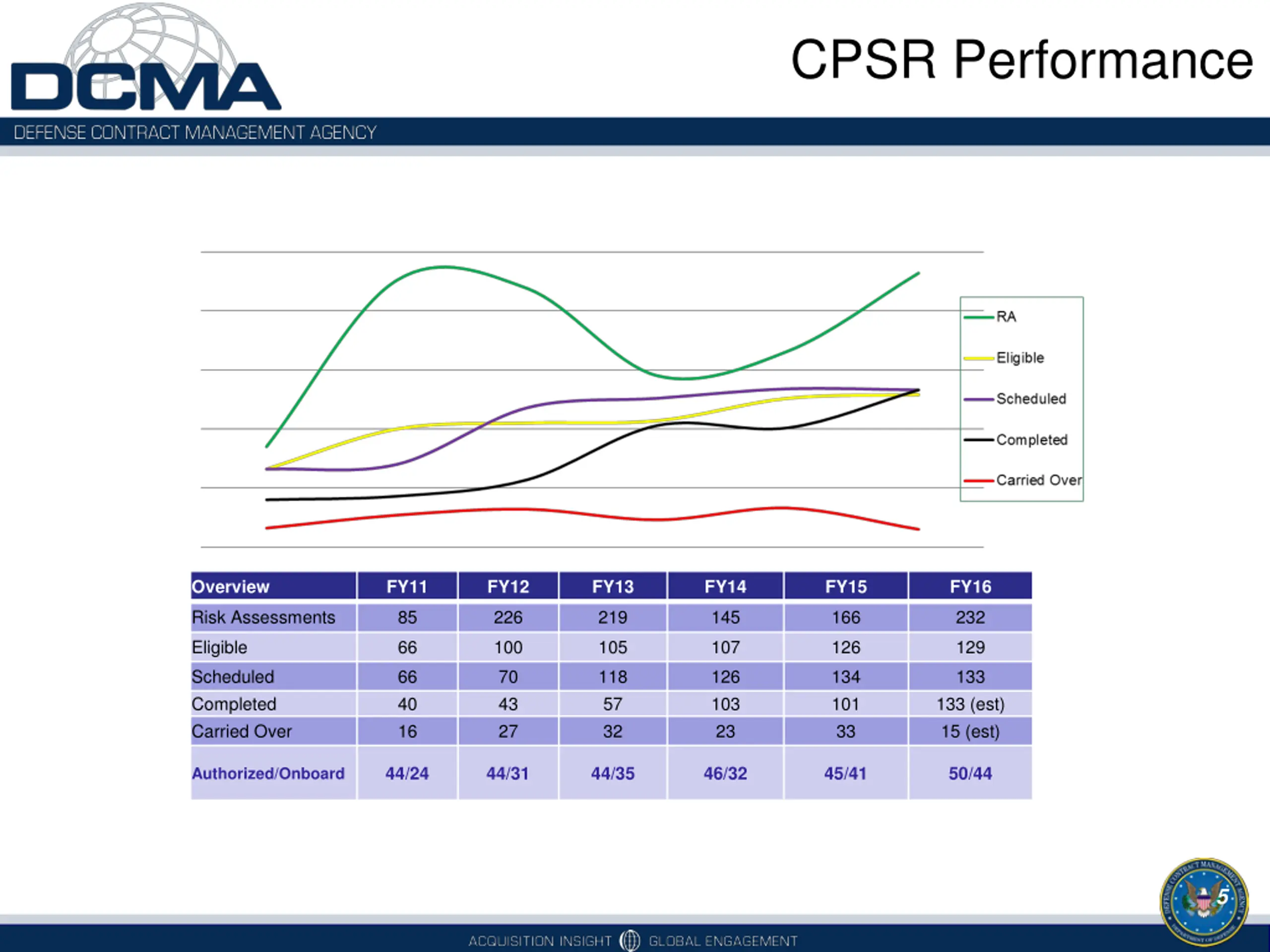 CPSR Performance Overview FY11 FY12 FY13 FY14 FY15 FY16 Risk Assessments 85 226 219 145 166 232 Eligible Scheduled Completed Carried Over 66 66 40 16 100 70 43 27 105 118 57 32 107 126 103 23 126 134 101 33 129 133 133 (est) 15 (est) 44/24 44/31 44/35 46/32 45/41 50/44 Authorized/Onboard 5