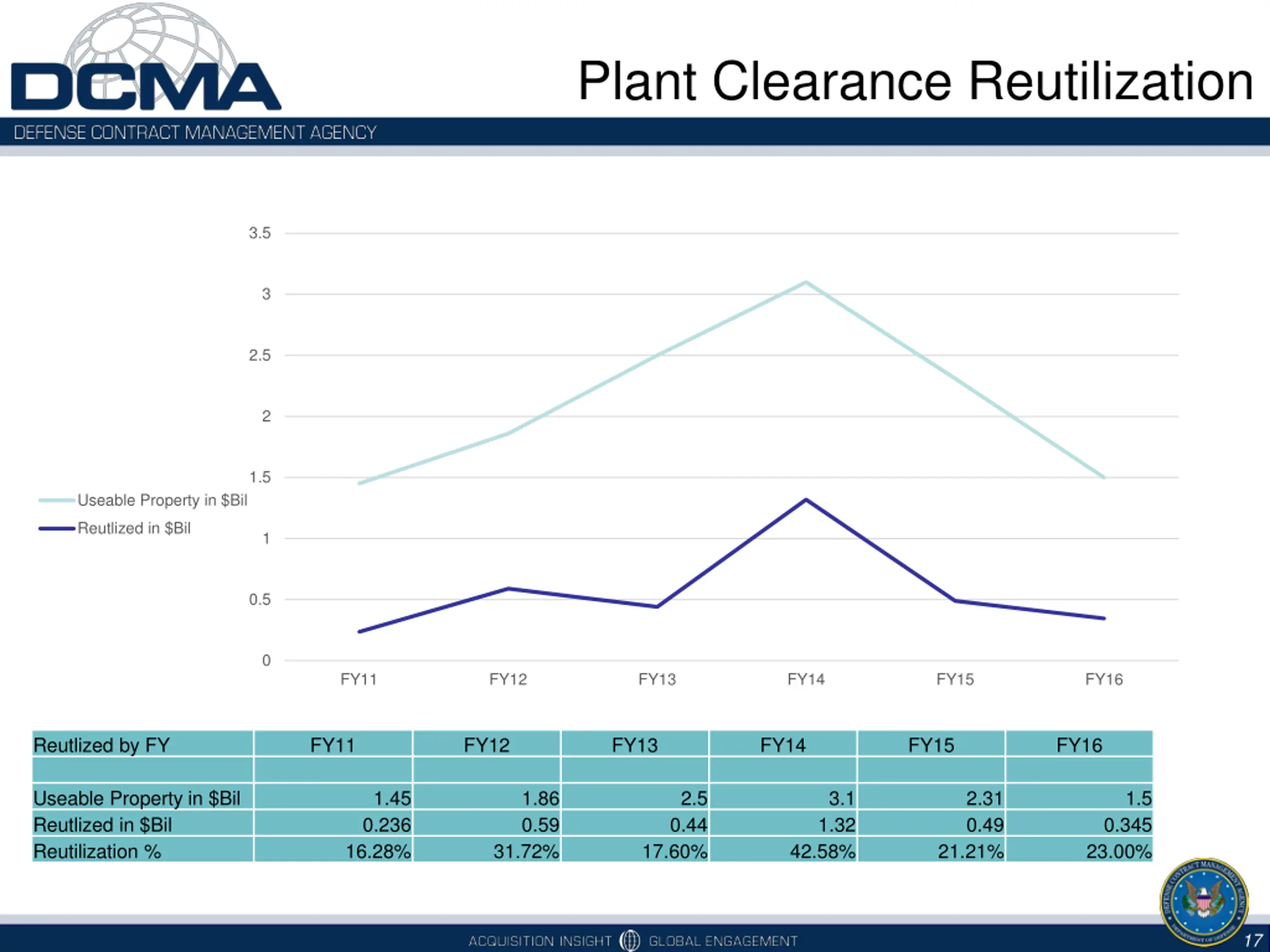 Plant Clearance Reutilization 3.5 3 2.5 2 1.5 Useable Property in $Bil Reutlized in $Bil 1 0.5 0 FY11 FY12 FY13 FY14 FY15 FY16 Reutlized by FY FY11 FY12 FY13 FY14 FY15 FY16 Useable Property in $Bil Reutlized in $Bil Reutilization % 1.45 0.236 16.28% 1.86 0.59 2.5 0.44 3.1 1.32 2.31 0.49 1.5 0.345 23.00% 31.72% 17.60% 42.58% 21.21% 17