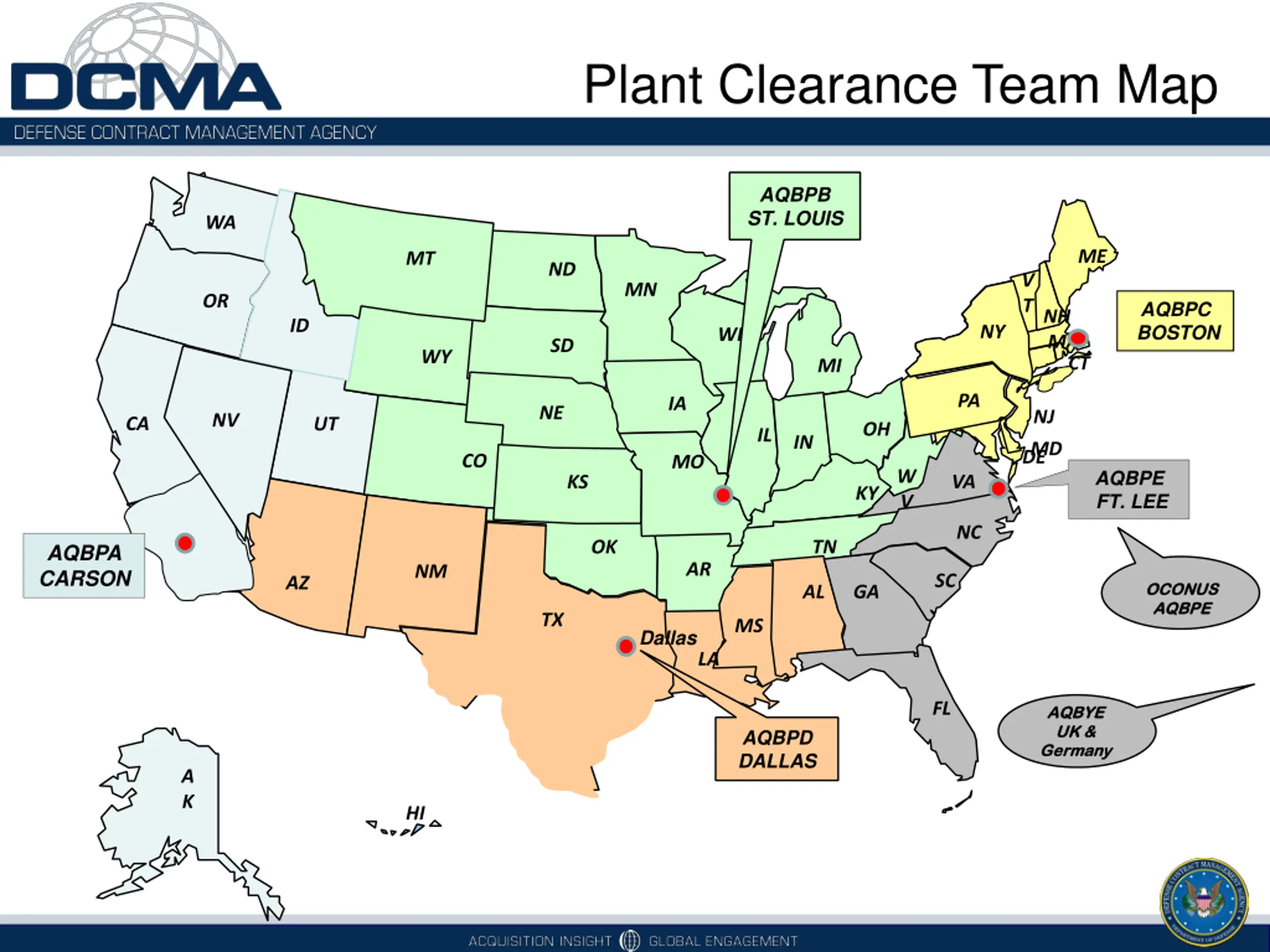 Plant Clearance Team Map AQBPB ST. LOUIS WA ME MT ND V TNH MN OR AQBPC BOSTON ID NY WI MA SD WY CT MI PA IA NE NJ NV CA UT OH IL IN DEMD CO MO AQBPE FT. LEE W V VA KS KY 11 NC OK TN AQBPA CARSON AR NM SC AZ OCONUS OCONUS AQBPE AQBPE AL GA TX MS Dallas LA FL AQBYE AQBYE UK & UK & Germany Germany 8 AQBPD DALLAS A K HI