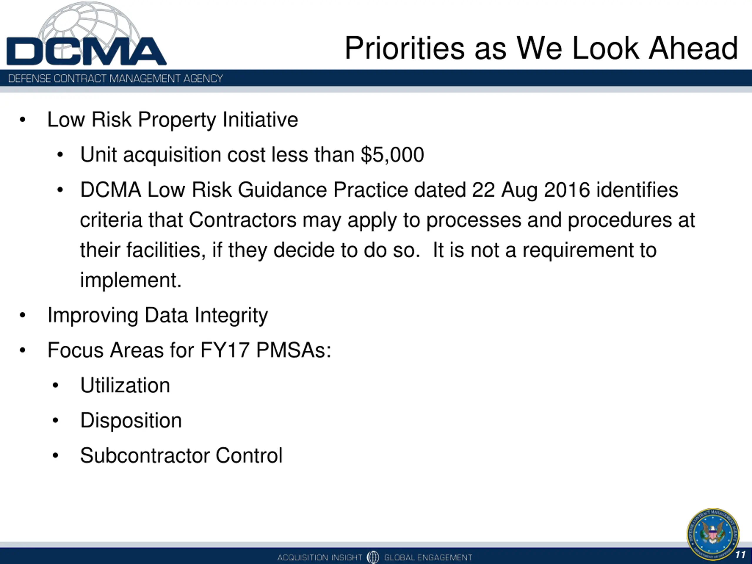 Priorities as We Look Ahead Low Risk Property Initiative Unit acquisition cost less than $5,000 DCMA Low Risk Guidance Practice dated 22 Aug 2016 identifies criteria that Contractors may apply to processes and procedures at their facilities, if they decide to do so. It is not a requirement to implement. Improving Data Integrity Focus Areas for FY17 PMSAs: Utilization Disposition Subcontractor Control 11