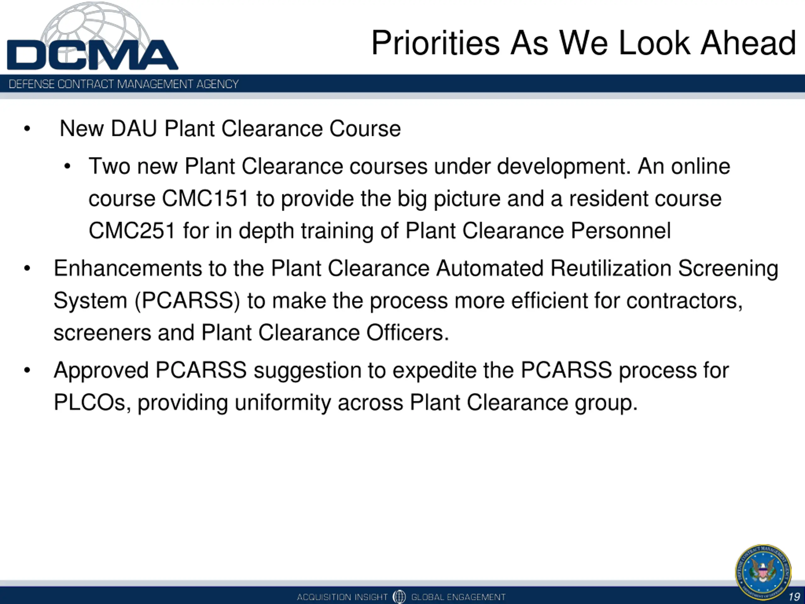 Priorities As We Look Ahead New DAU Plant Clearance Course Two new Plant Clearance courses under development. An online course CMC151 to provide the big picture and a resident course CMC251 for in depth training of Plant Clearance Personnel Enhancements to the Plant Clearance Automated Reutilization Screening System (PCARSS) to make the process more efficient for contractors, screeners and Plant Clearance Officers. Approved PCARSS suggestion to expedite the PCARSS process for PLCOs, providing uniformity across Plant Clearance group. 19