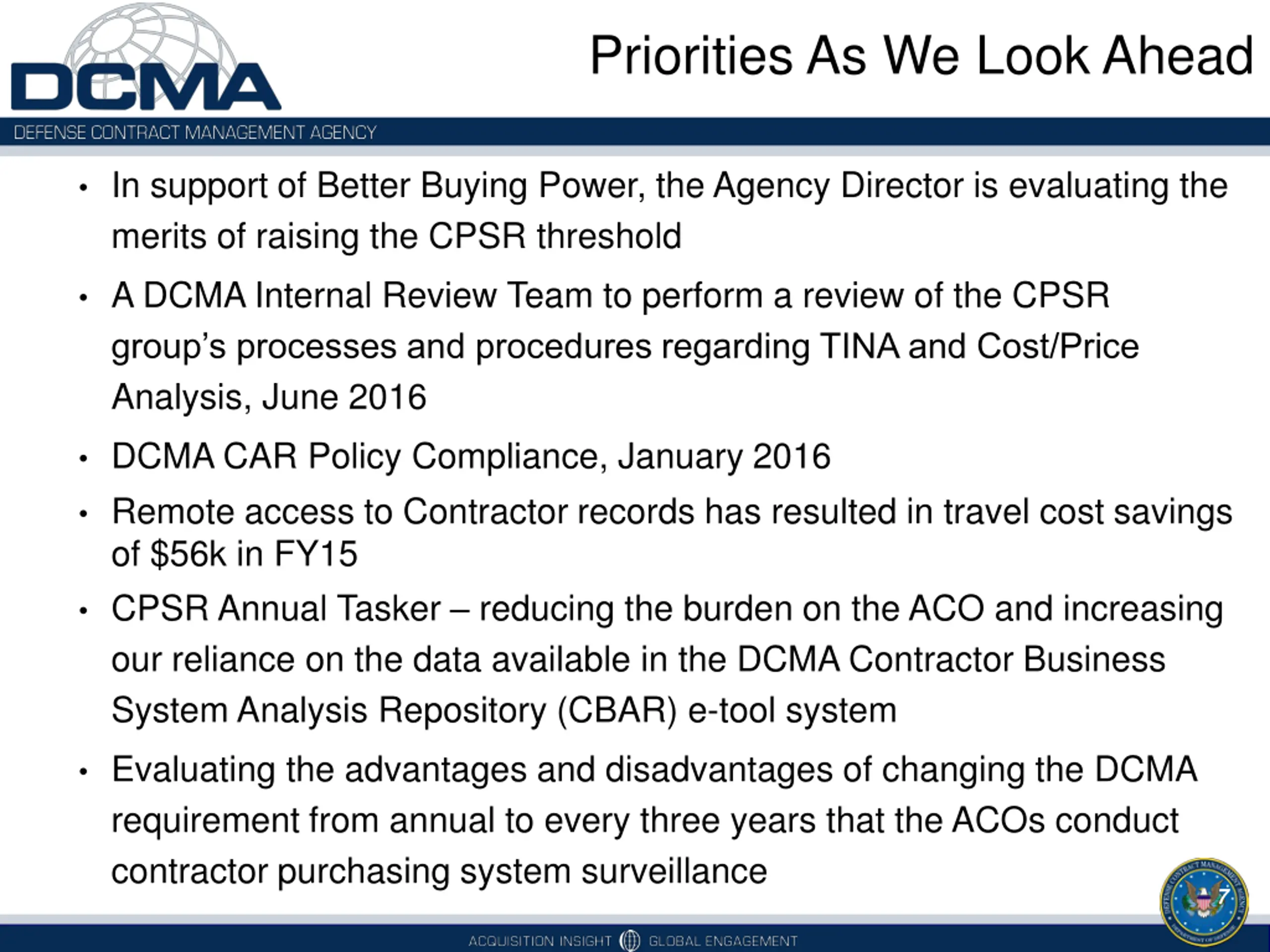 Priorities As We Look Ahead In support of Better Buying Power, the Agency Director is evaluating the merits of raising the CPSR threshold A DCMA Internal Review Team to perform a review of the CPSR group s processes and procedures regarding TINA and Cost/Price Analysis, June 2016 DCMA CAR Policy Compliance, January 2016 Remote access to Contractor records has resulted in travel cost savings of $56k in FY15 CPSR Annual Tasker reducing the burden on the ACO and increasing our reliance on the data available in the DCMA Contractor Business System Analysis Repository (CBAR) e-tool system Evaluating the advantages and disadvantages of changing the DCMA requirement from annual to every three years that the ACOs conduct contractor purchasing system surveillance 7