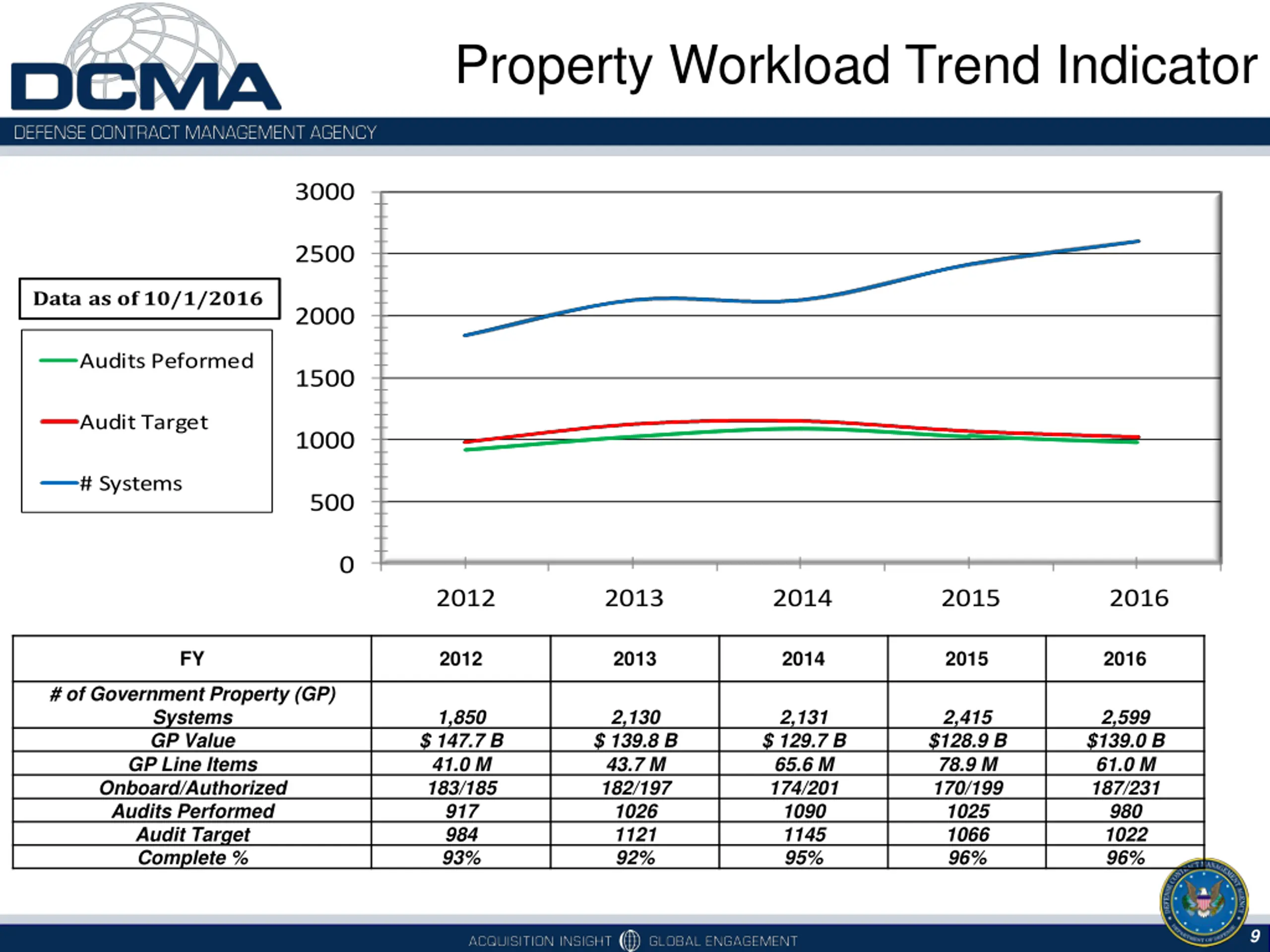 Property Workload Trend Indicator 3000 2500 Data as of 10/1/2016 2000 Audits Peformed 1500 Audit Target 1000 # Systems 500 0 2012 2013 2014 2015 2016 FY 2012 2013 2014 2015 2016 # of Government Property (GP) Systems GP Value GP Line Items Onboard/Authorized Audits Performed Audit Target Complete % 1,850 $ 147.7 B 41.0 M 183/185 917 984 93% 2,130 $ 139.8 B 43.7 M 182/197 1026 1121 92% 2,131 $ 129.7 B 65.6 M 174/201 1090 1145 95% 2,415 $128.9 B 78.9 M 170/199 1025 1066 96% 2,599 $139.0 B 61.0 M 187/231 980 1022 96% 9 9