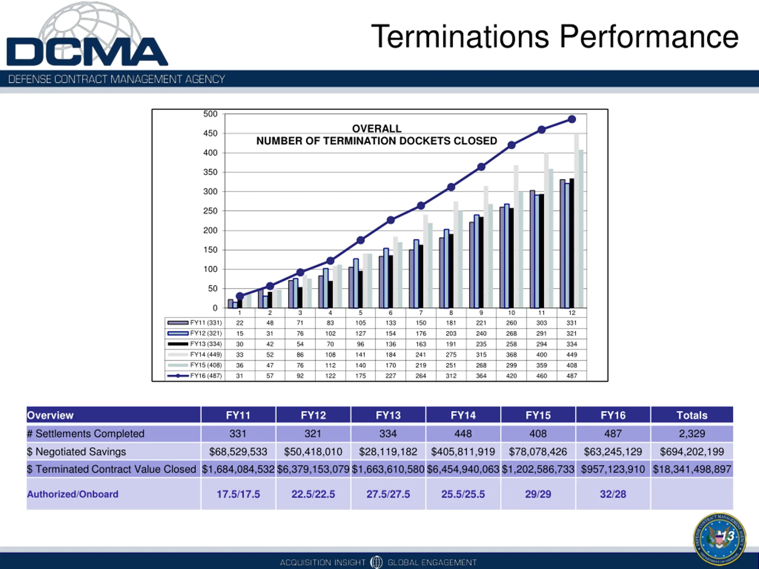 Terminations Performance 500 OVERALL 450 NUMBER OF TERMINATION DOCKETS CLOSED 400 350 300 250 200 150 100 50 0 1 22 2 48 3 4 5 6 7 8 9 10 260 11 303 12 331 FY11 (331) 71 83 105 133 150 181 221 FY12 (321) 15 31 76 102 127 154 176 203 240 268 291 321 FY13 (334) 30 42 54 70 96 136 163 191 235 258 294 334 FY14 (449) 33 52 86 108 141 184 241 275 315 368 400 449 FY15 (408) 36 47 76 112 140 170 219 251 268 299 359 408 FY16 (487) 31 57 92 122 175 227 264 312 364 420 460 487 Overview FY11 FY12 FY13 FY14 FY15 FY16 Totals # Settlements Completed 331 321 334 448 408 487 2,329 $ Negotiated Savings $ Terminated Contract Value Closed $1,684,084,532 $6,379,153,079 $1,663,610,580 $6,454,940,063 $1,202,586,733 $957,123,910 $18,341,498,897 $68,529,533 $50,418,010 $28,119,182 $405,811,919 $78,078,426 $63,245,129 $694,202,199 17.5/17.5 22.5/22.5 27.5/27.5 25.5/25.5 29/29 32/28 Authorized/Onboard 13