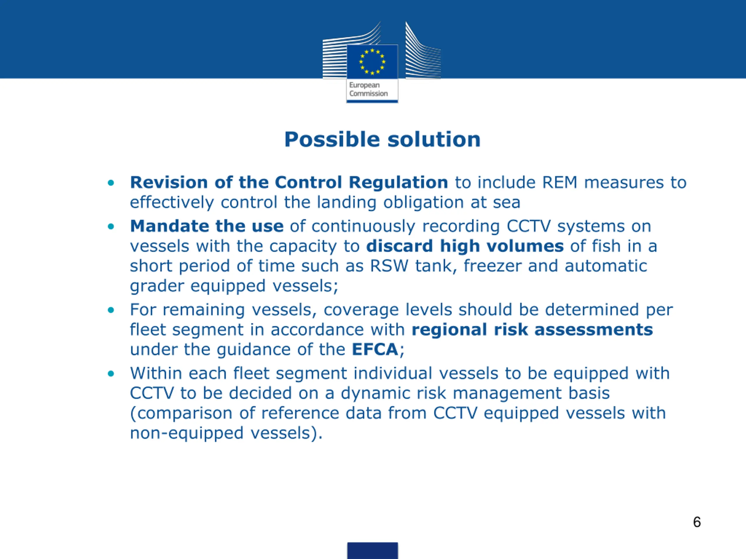 Possible solution Revision of the Control Regulation to include REM measures to effectively control the landing obligation at sea Mandate the use of continuously recording CCTV systems on vessels with the capacity to discard high volumes of fish in a short period of time such as RSW tank, freezer and automatic grader equipped vessels; For remaining vessels, coverage levels should be determined per fleet segment in accordance with regional risk assessments under the guidance of the EFCA; Within each fleet segment individual vessels to be equipped with CCTV to be decided on a dynamic risk management basis (comparison of reference data from CCTV equipped vessels with non-equipped vessels). 6