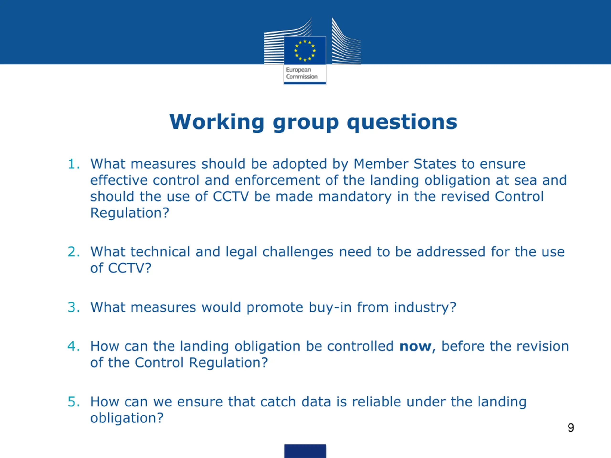 Working group questions 1. What measures should be adopted by Member States to ensure effective control and enforcement of the landing obligation at sea and should the use of CCTV be made mandatory in the revised Control Regulation? 2. What technical and legal challenges need to be addressed for the use of CCTV? 3. What measures would promote buy-in from industry? 4. How can the landing obligation be controlled now, before the revision of the Control Regulation? 5. How can we ensure that catch data is reliable under the landing obligation? 9