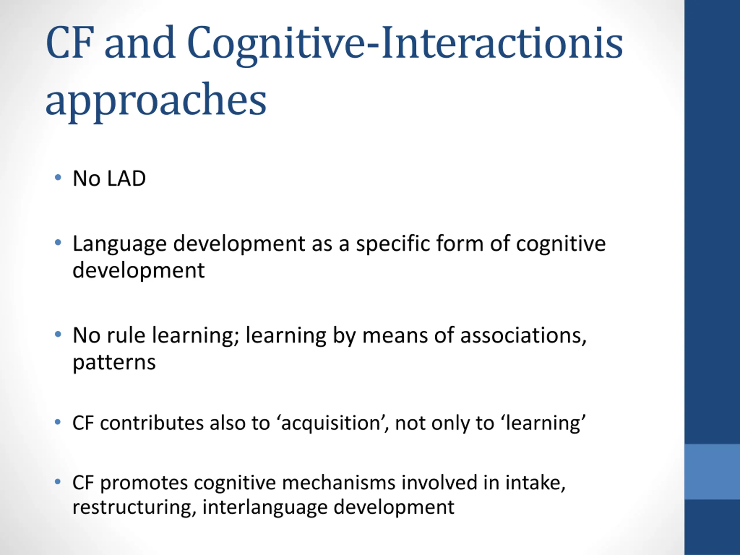 CF and Cognitive-Interactionis approaches No LAD Language development as a specific form of cognitive development No rule learning; learning by means of associations, patterns CF contributes also to acquisition , not only to learning CF promotes cognitive mechanisms involved in intake, restructuring, interlanguage development