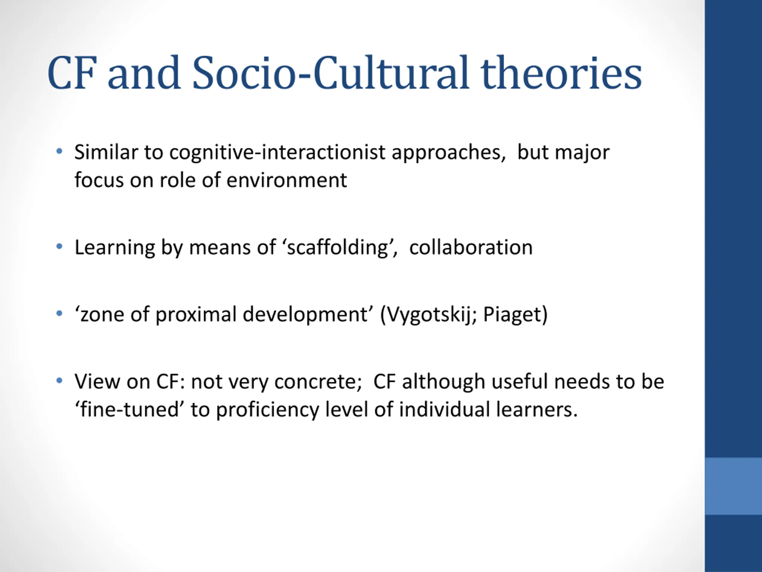 CF and Socio-Culturaltheories Similar to cognitive-interactionist approaches, but major focus on role of environment Learning by means of scaffolding , collaboration zone of proximal development (Vygotskij; Piaget) View on CF: not very concrete; CF although useful needs to be fine-tuned to proficiency level of individual learners.