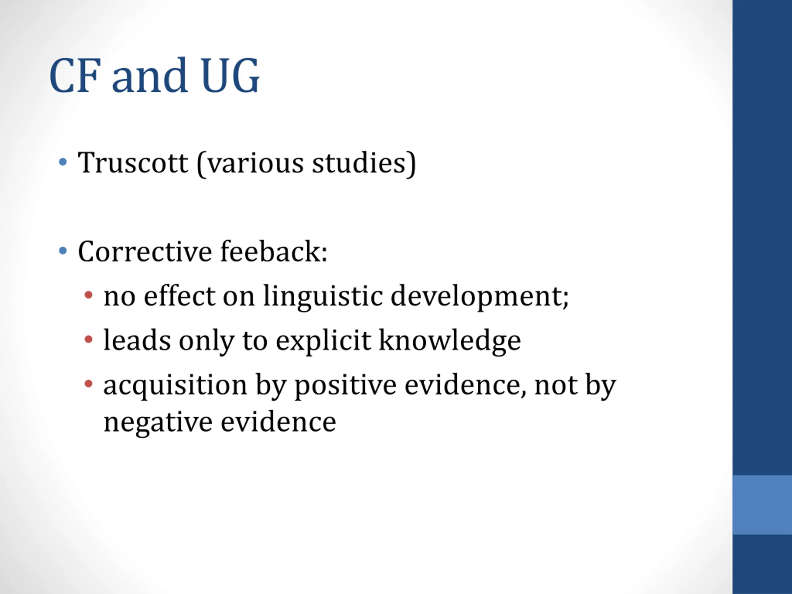 CF and UG Truscott (various studies) Corrective feeback: no effect on linguistic development; leads only to explicit knowledge acquisition by positive evidence, not by negative evidence