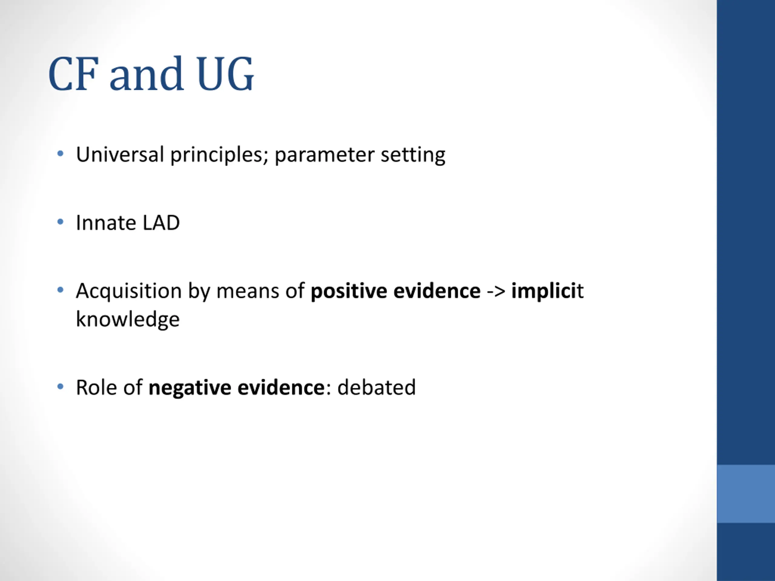 CF and UG Universal principles; parameter setting Innate LAD Acquisition by means of positive evidence -> implicit knowledge Role of negative evidence: debated