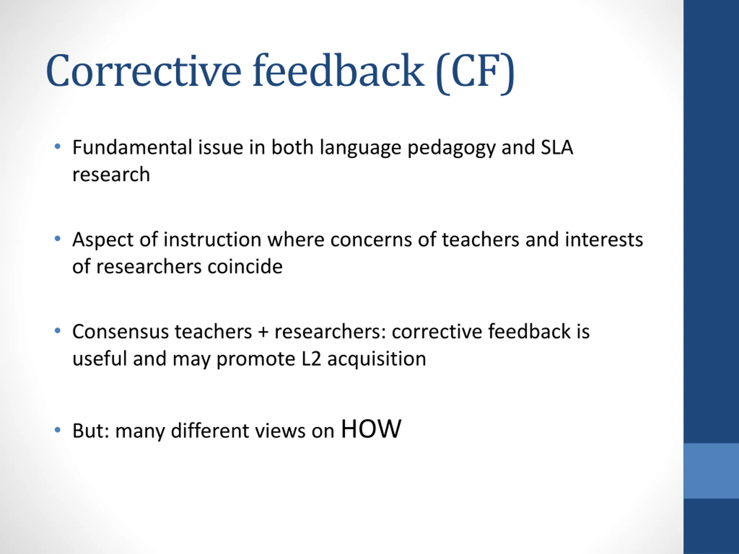 Correctivefeedback (CF) Fundamental issue in both language pedagogy and SLA research Aspect of instruction where concerns of teachers and interests of researchers coincide Consensus teachers + researchers: corrective feedback is useful and may promote L2 acquisition But: many different views on HOW