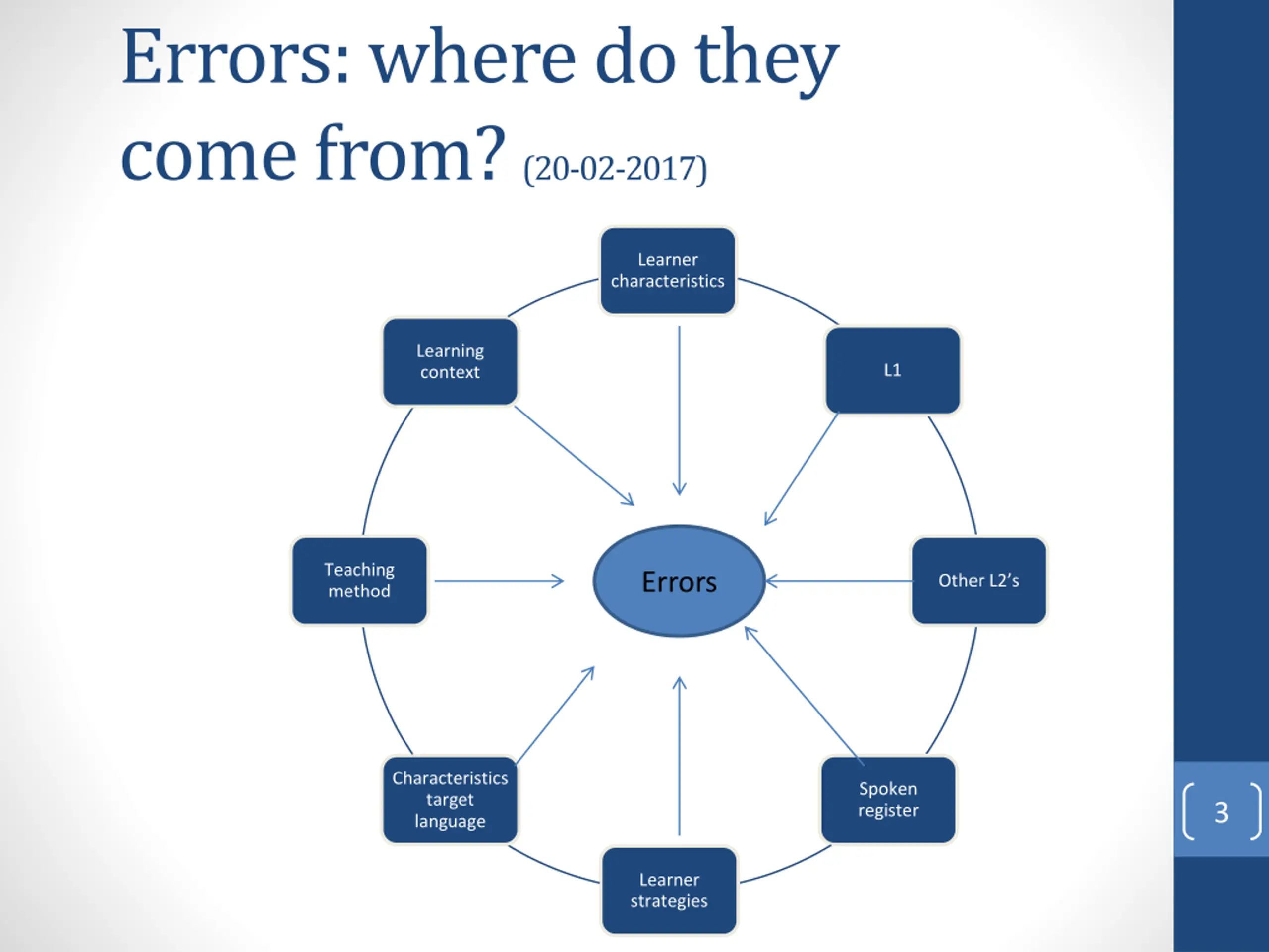 Errors: wheredo they comefrom? (20-02-2017) Learner characteristics Learning context L1 Teaching method Errors Other L2 s Characteristics target language Spoken register 3 Learner strategies