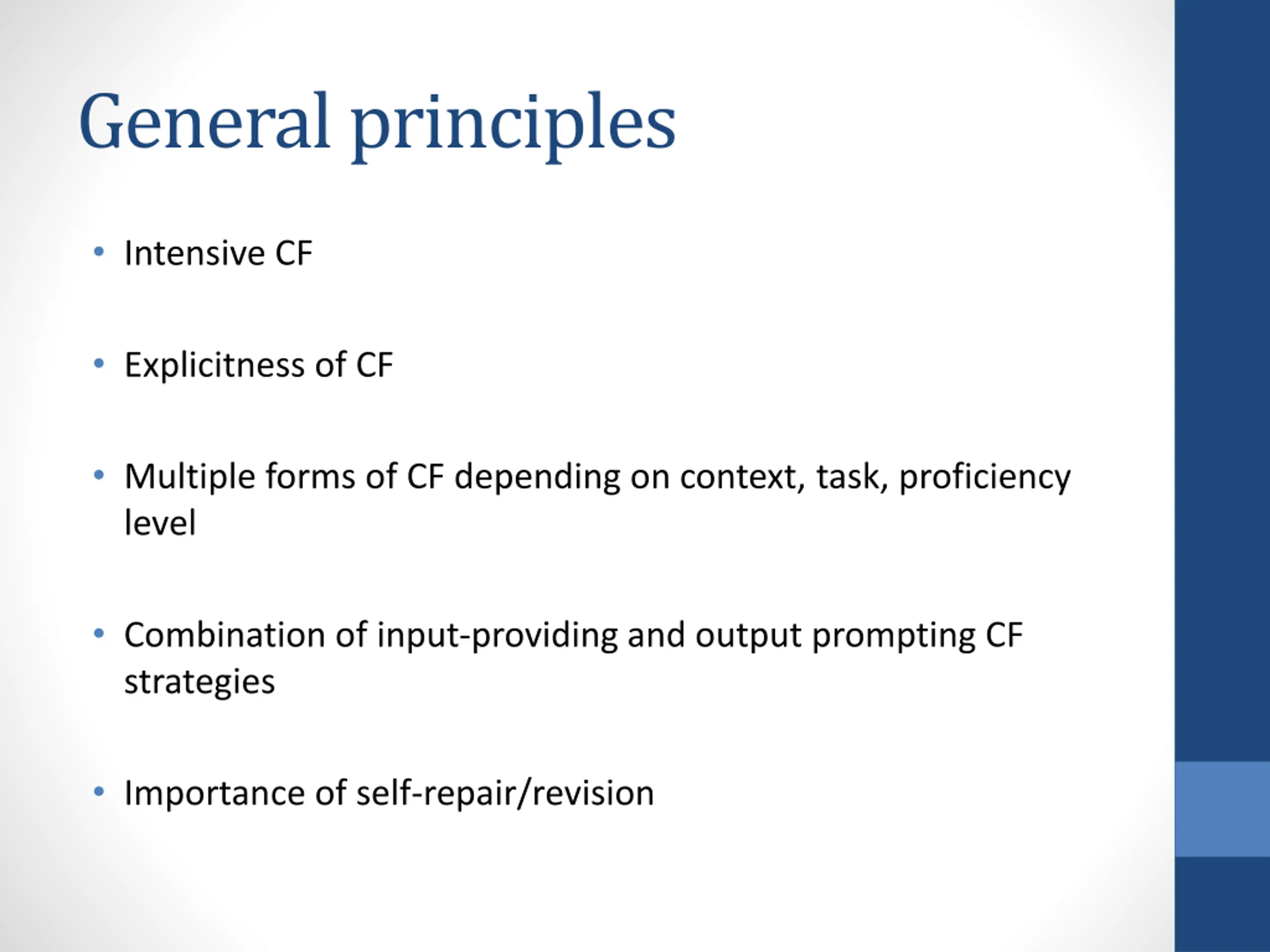 General principles Intensive CF Explicitness of CF Multiple forms of CF depending on context, task, proficiency level Combination of input-providing and output prompting CF strategies Importance of self-repair/revision