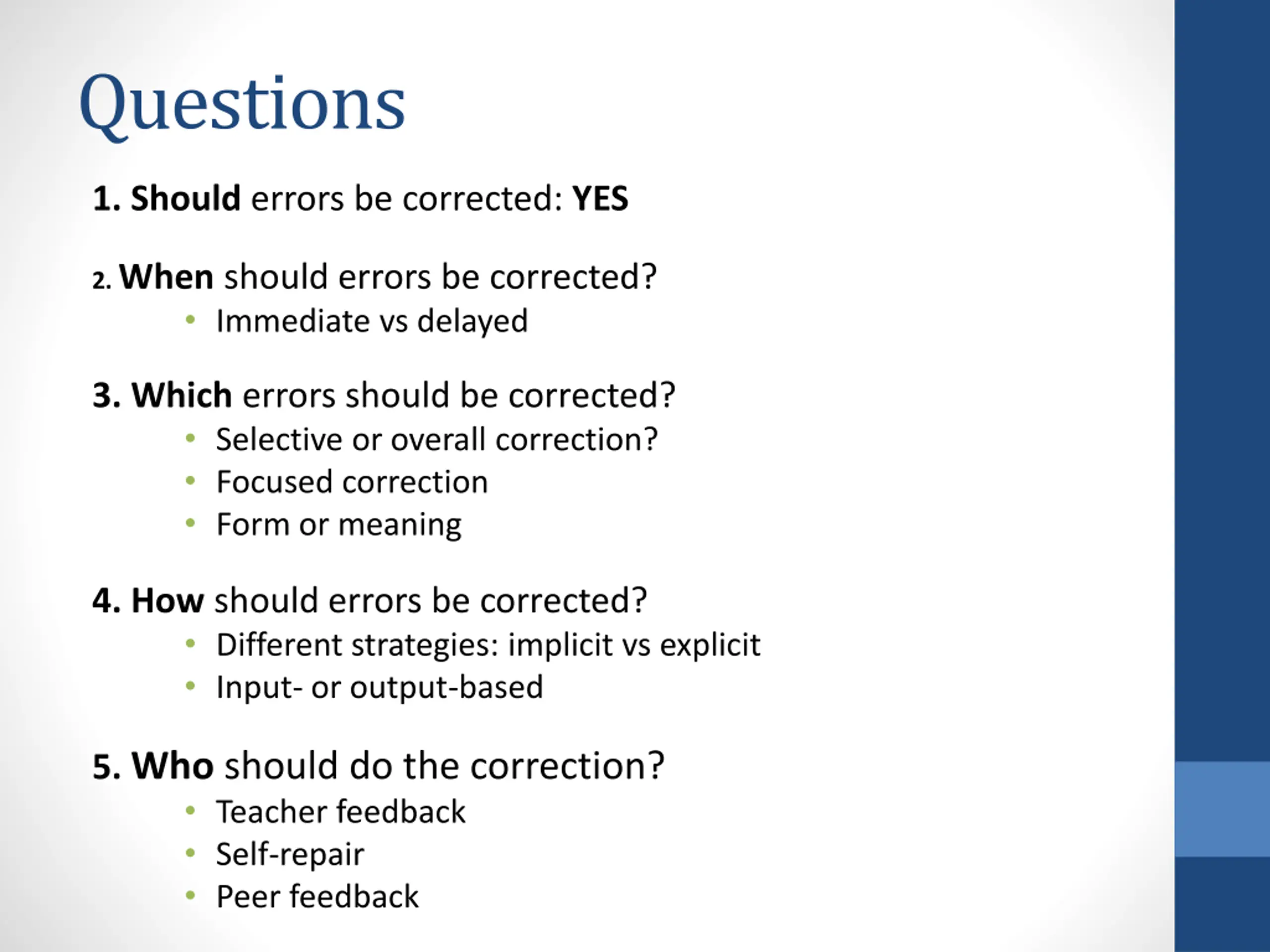 Questions 1. Should errors be corrected: YES 2. When should errors be corrected? Immediate vs delayed 3. Which errors should be corrected? Selective or overall correction? Focused correction Form or meaning 4. How should errors be corrected? Different strategies: implicit vs explicit Input- or output-based 5. Who should do the correction? Teacher feedback Self-repair Peer feedback
