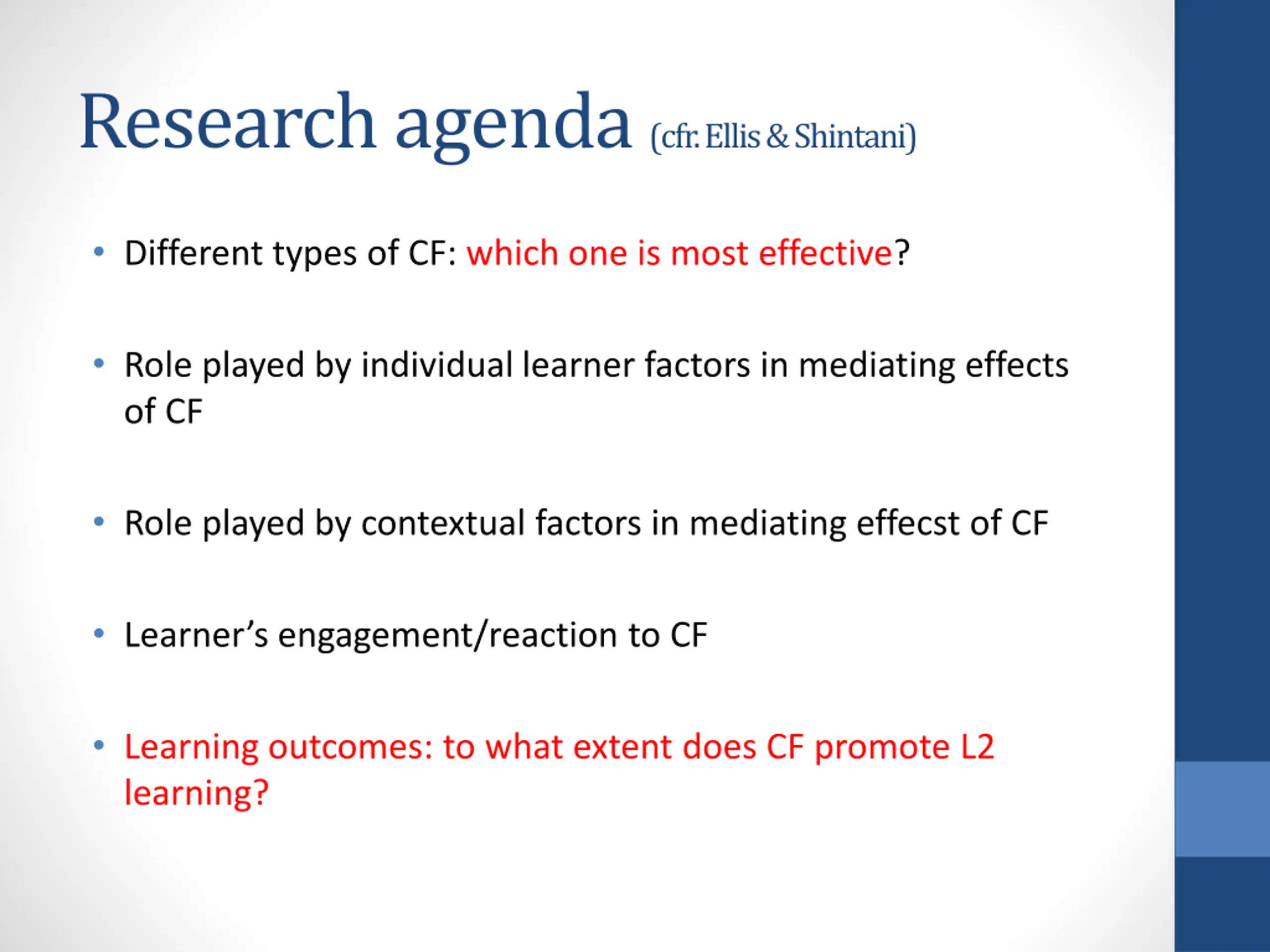 Research agenda (cfr. Ellis & Shintani) Different types of CF: which one is most effective? Role played by individual learner factors in mediating effects of CF Role played by contextual factors in mediating effecst of CF Learner s engagement/reaction to CF Learning outcomes: to what extent does CF promote L2 learning?
