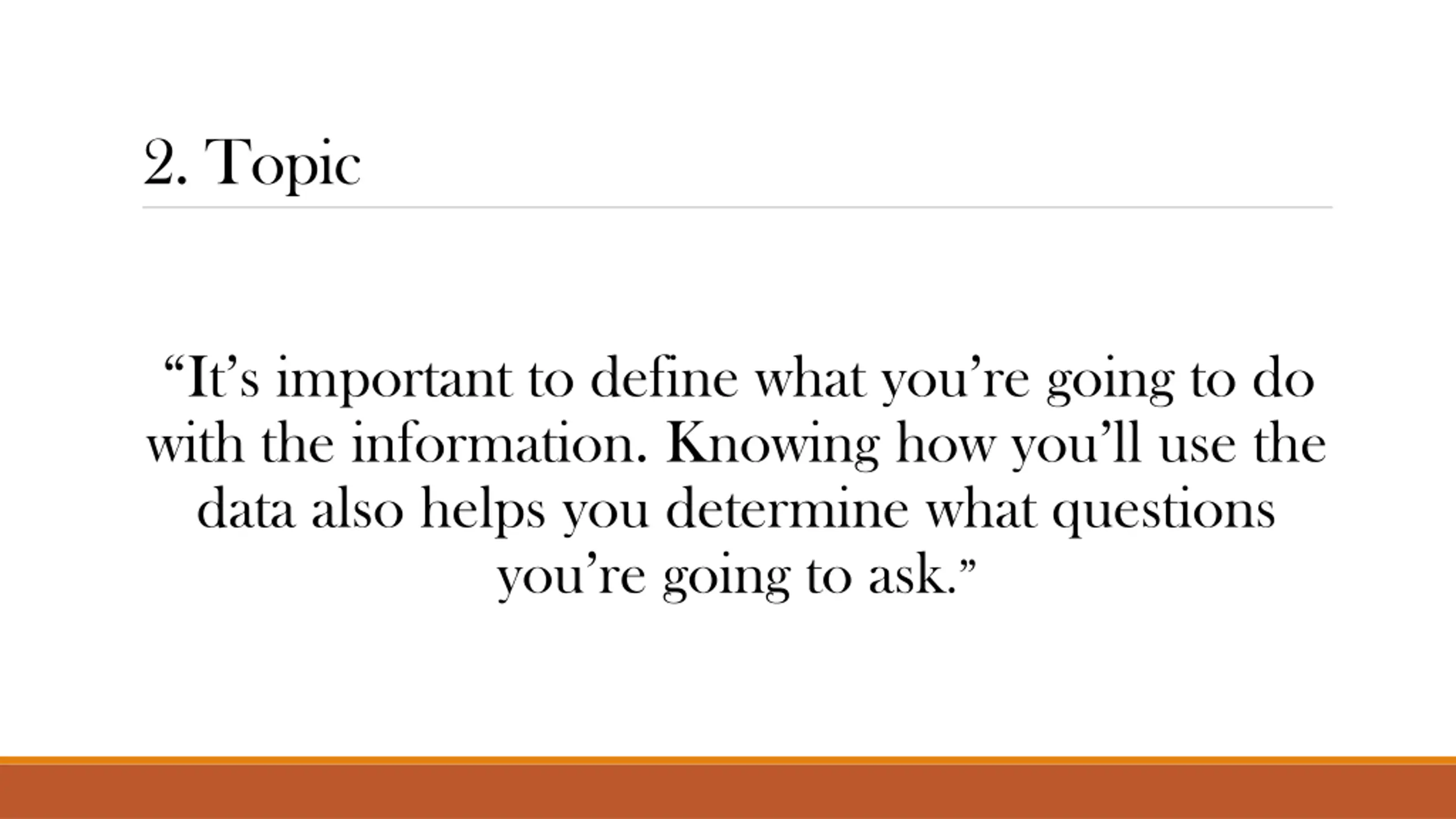 2. Topic It s important to define what you re going to do with the information. Knowing how you ll use the data also helps you determine what questions you re going to ask.