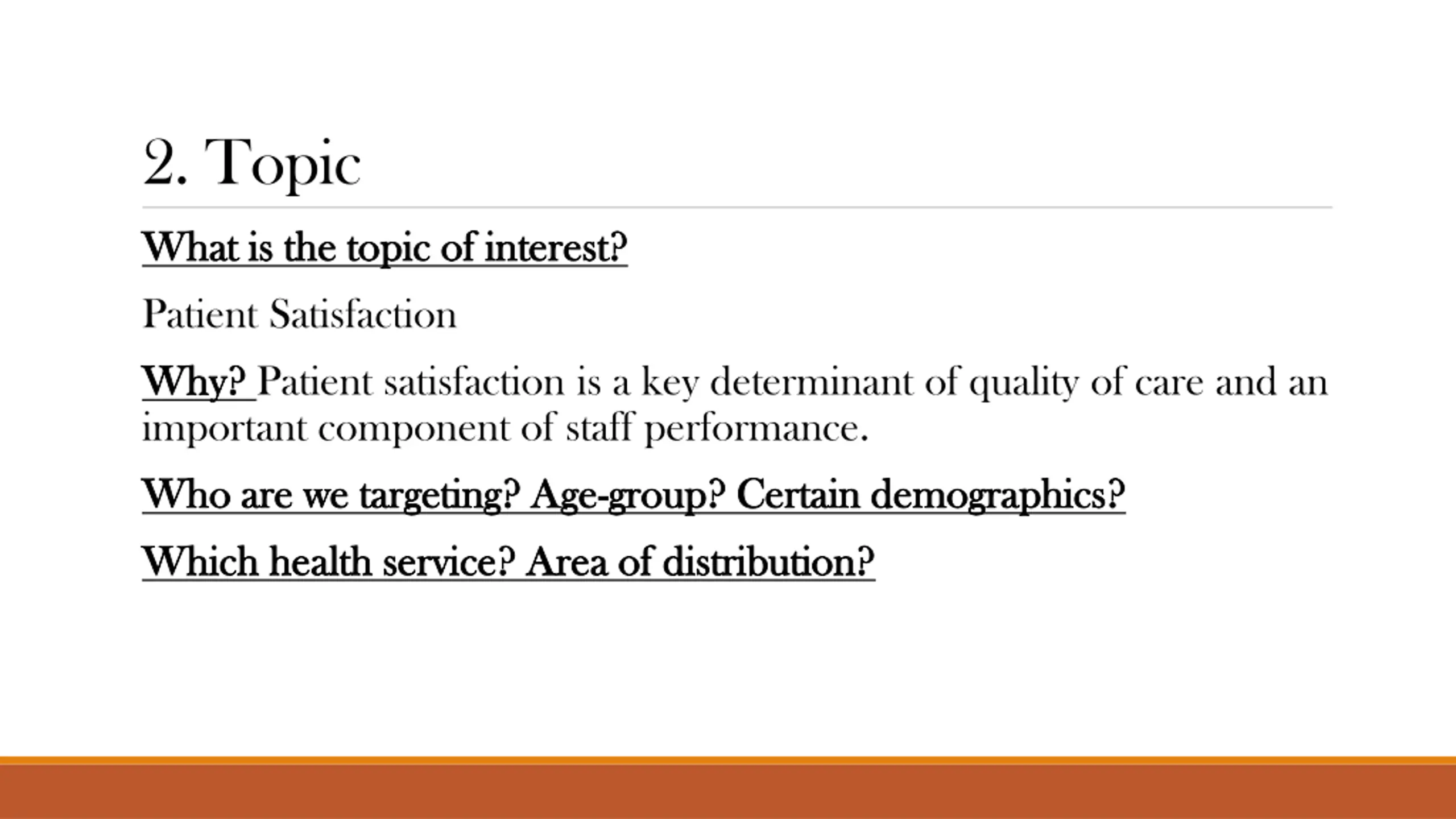 2. Topic What What is the topic of interest is the topic of interest? ? Patient Satisfaction Why? Why? Patient satisfaction is a key determinant of quality of care and an important component of staff performance. Who are we targeting? Age Who are we targeting? Age- -group? Certain demographics? group? Certain demographics? Which health service? Area of distribution? Which health service? Area of distribution?