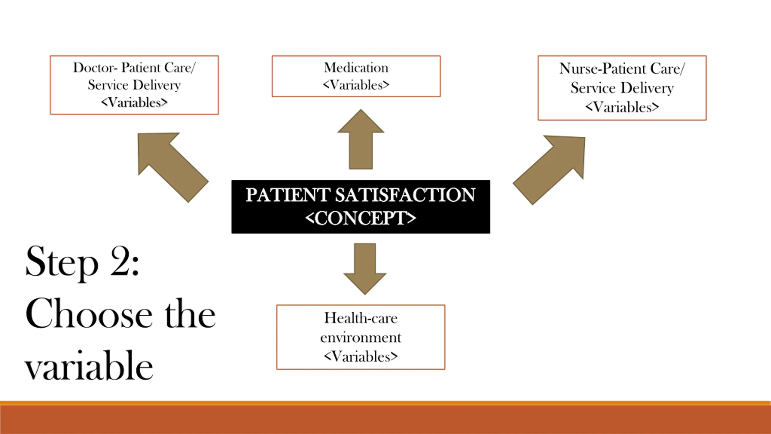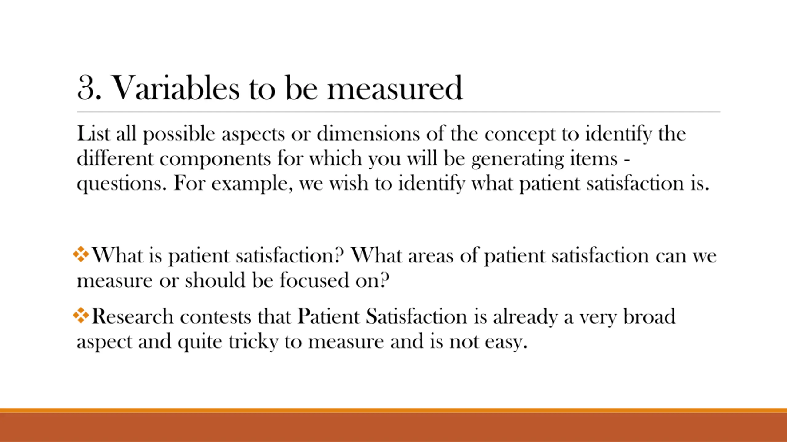 3. Variables to be measured List all possible aspects or dimensions of the concept to identify the different components for which you will be generating items - questions. For example, we wish to identify what patient satisfaction is. What is patient satisfaction? What areas of patient satisfaction can we measure or should be focused on? Research contests that Patient Satisfaction is already a very broad aspect and quite tricky to measure and is not easy.