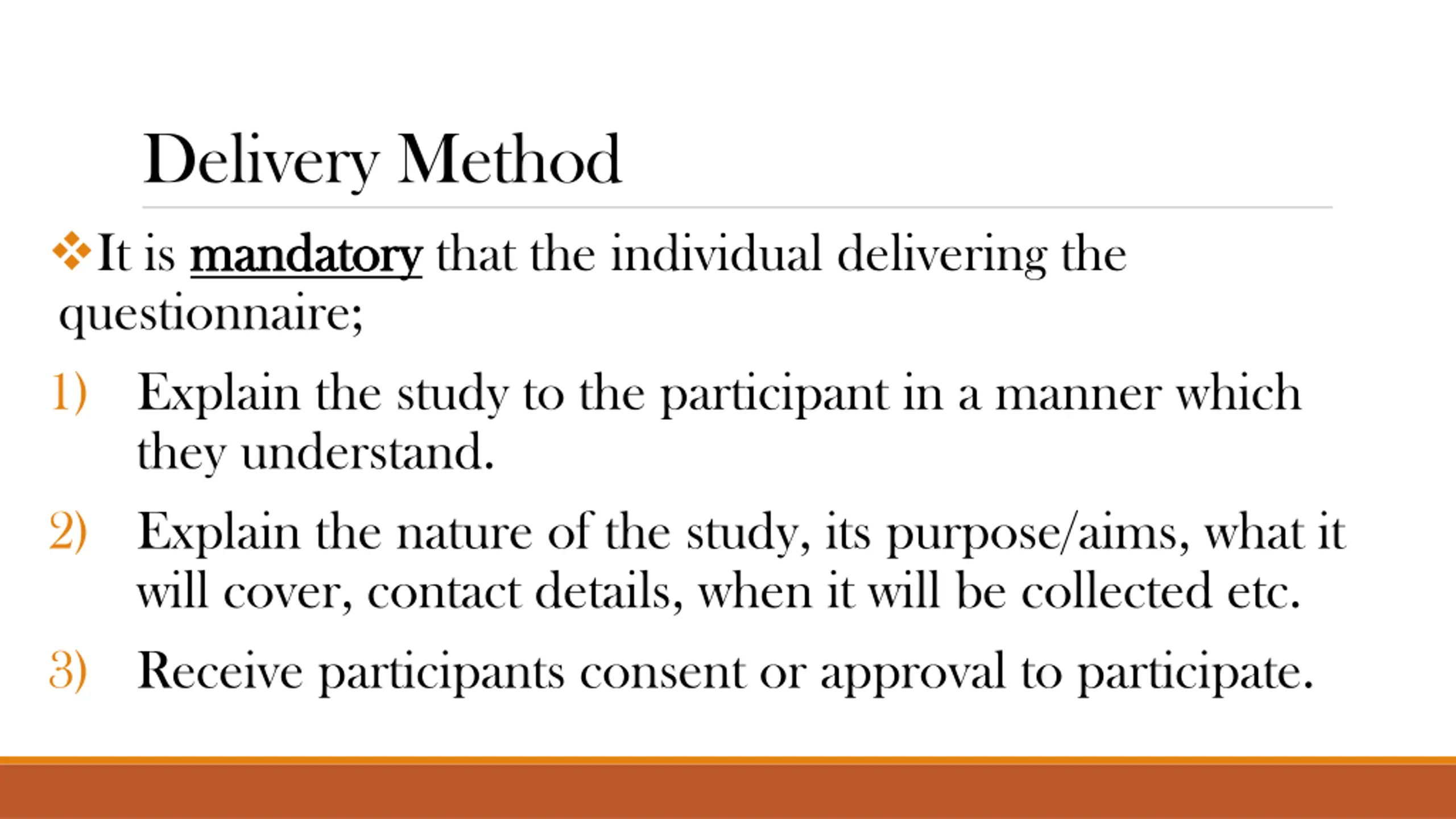 Delivery Method It is mandatory mandatory that the individual delivering the questionnaire; 1) Explain the study to the participant in a manner which they understand. 2) Explain the nature of the study, its purpose/aims, what it will cover, contact details, when it will be collected etc. 3) Receive participants consent or approval to participate.