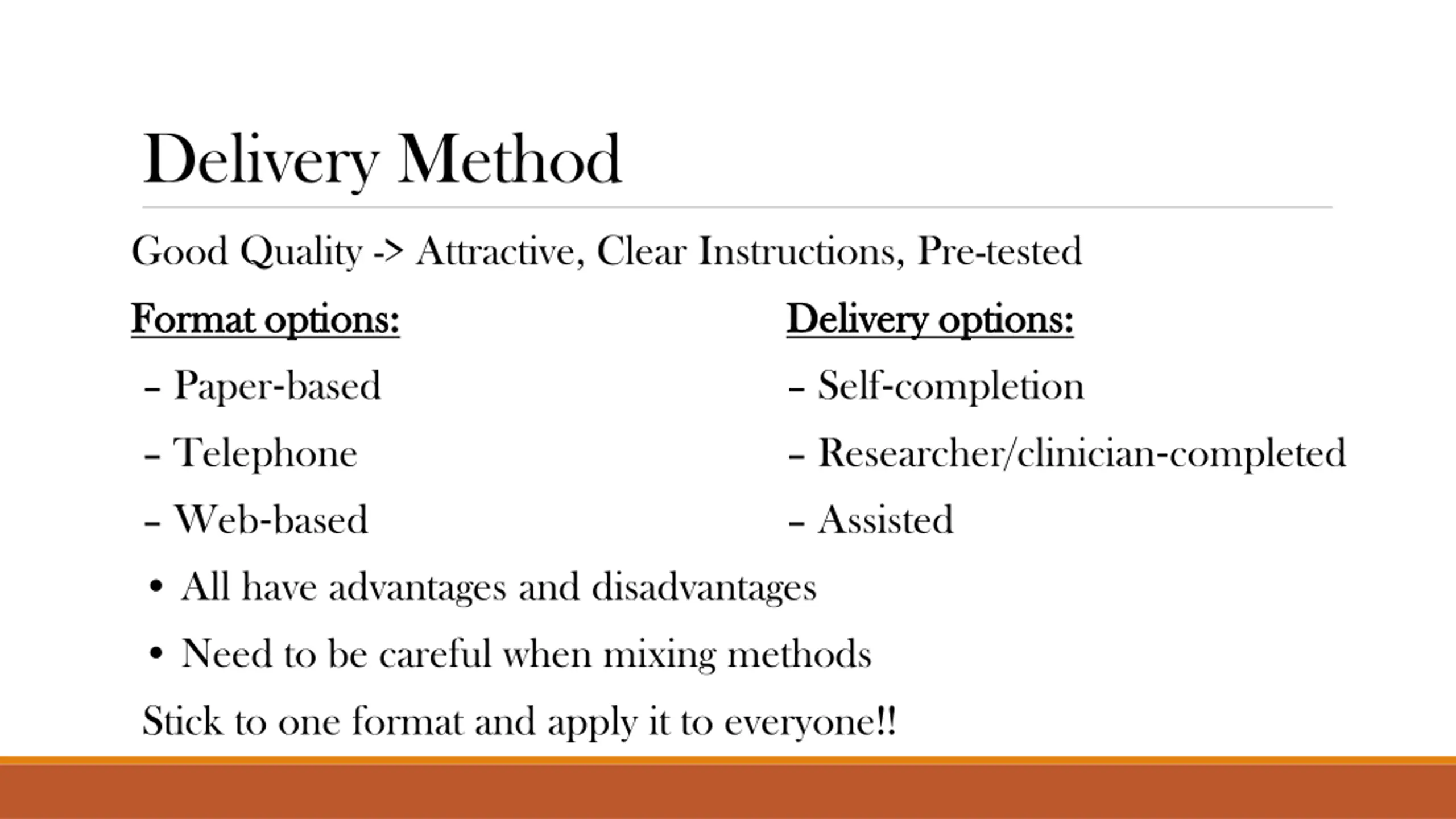 Delivery Method Good Quality -> Attractive, Clear Instructions, Pre-tested Format options: Format options: Delivery Delivery options options: : Paper based Self completion Researcher/clinician completed Telephone Web based Assisted All have advantages and disadvantages Need to be careful when mixing methods Stick to one format and apply it to everyone!!