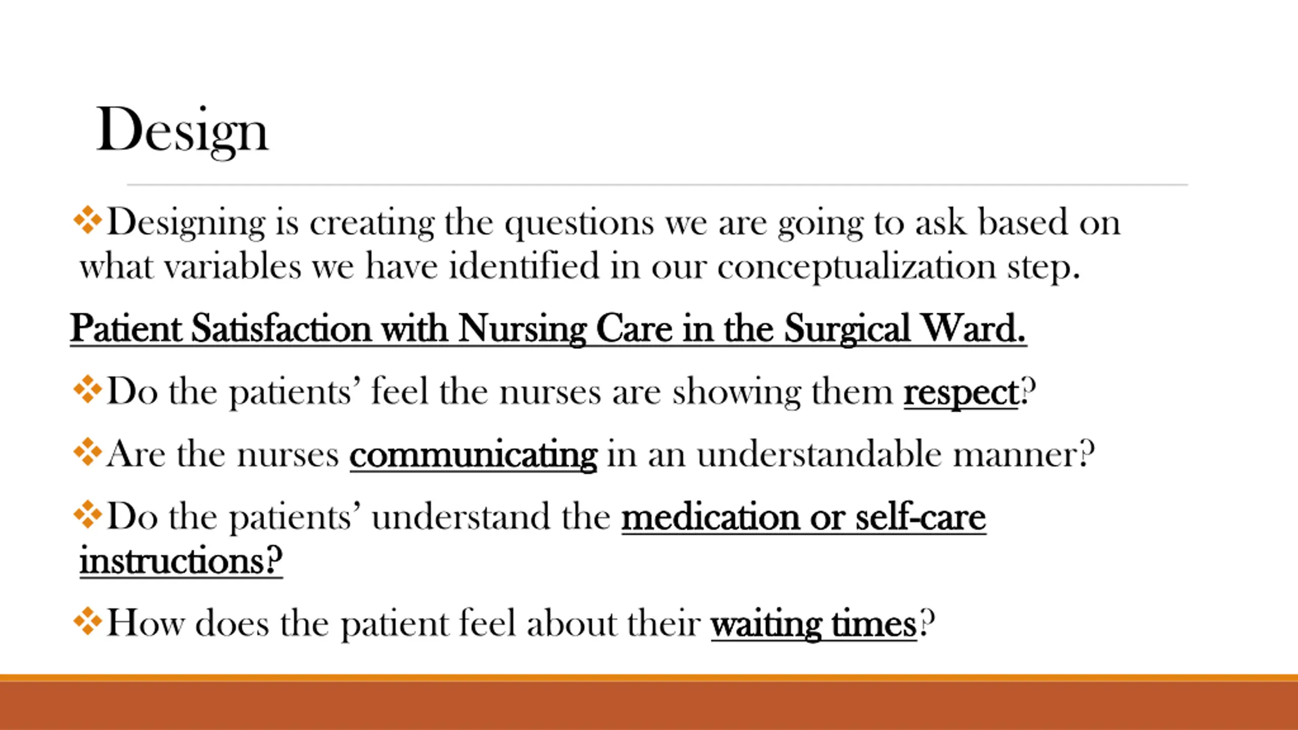 Design Designing is creating the questions we are going to ask based on what variables we have identified in our conceptualization step. Patient Satisfaction with Nursing Care in the Surgical Ward. Patient Satisfaction with Nursing Care in the Surgical Ward. Do the patients feel the nurses are showing them respect Are the nurses communicating communicating in an understandable manner? Do the patients understand the medication or self instructions? instructions? How does the patient feel about their waiting times respect? medication or self- -care care waiting times?