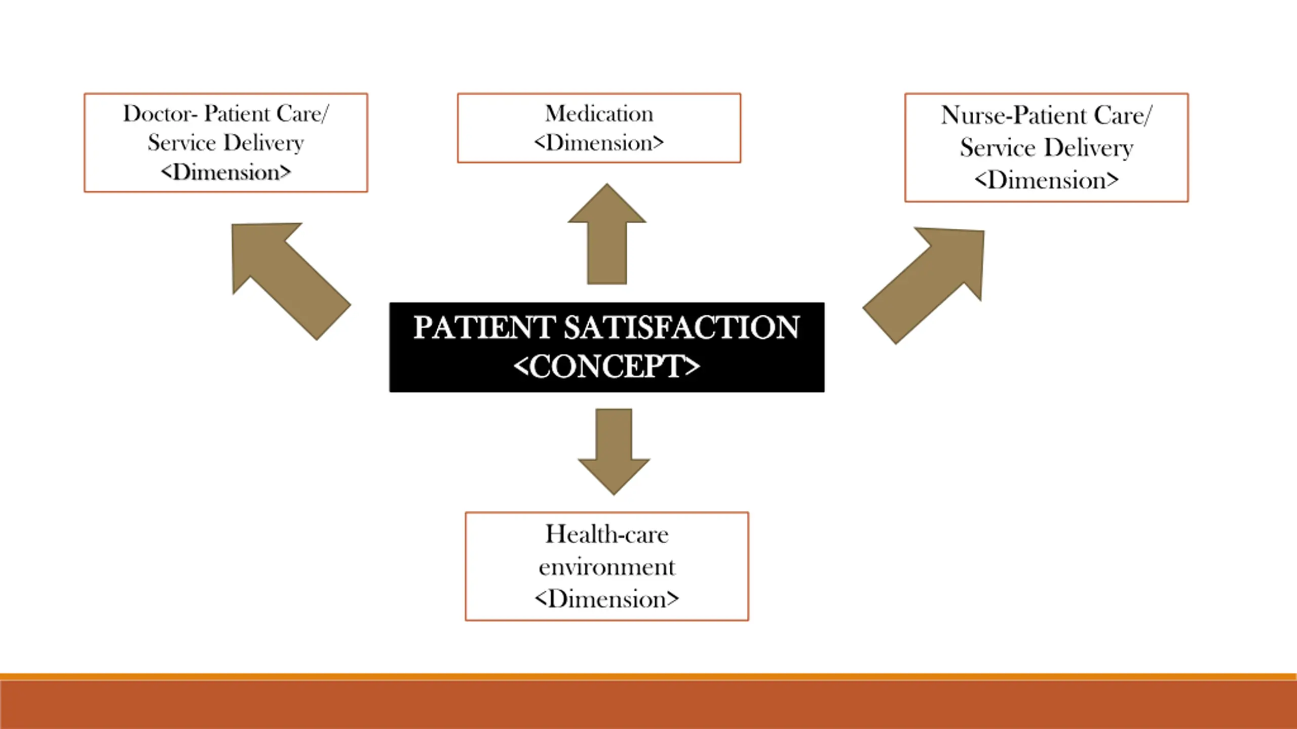 Doctor- Patient Care/ Service Delivery <Dimension> Medication <Dimension> Nurse-Patient Care/ Service Delivery <Dimension> PATIENT SATISFACTION PATIENT SATISFACTION <CONCEPT> <CONCEPT> Health-care environment <Dimension>