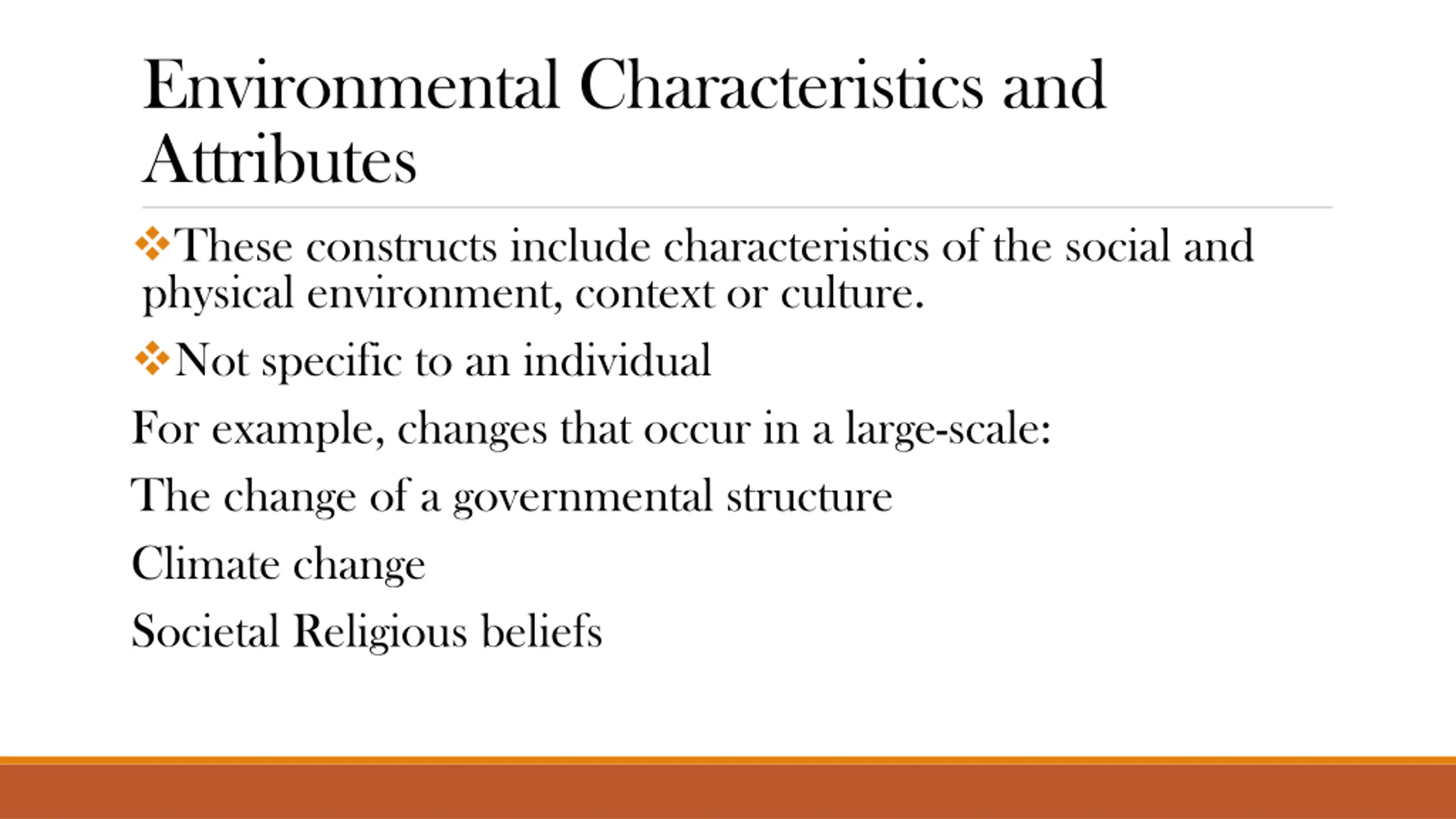 Environmental Characteristics and Attributes These constructs include characteristics of the social and physical environment, context or culture. Not specific to an individual For example, changes that occur in a large-scale: The change of a governmental structure Climate change Societal Religious beliefs