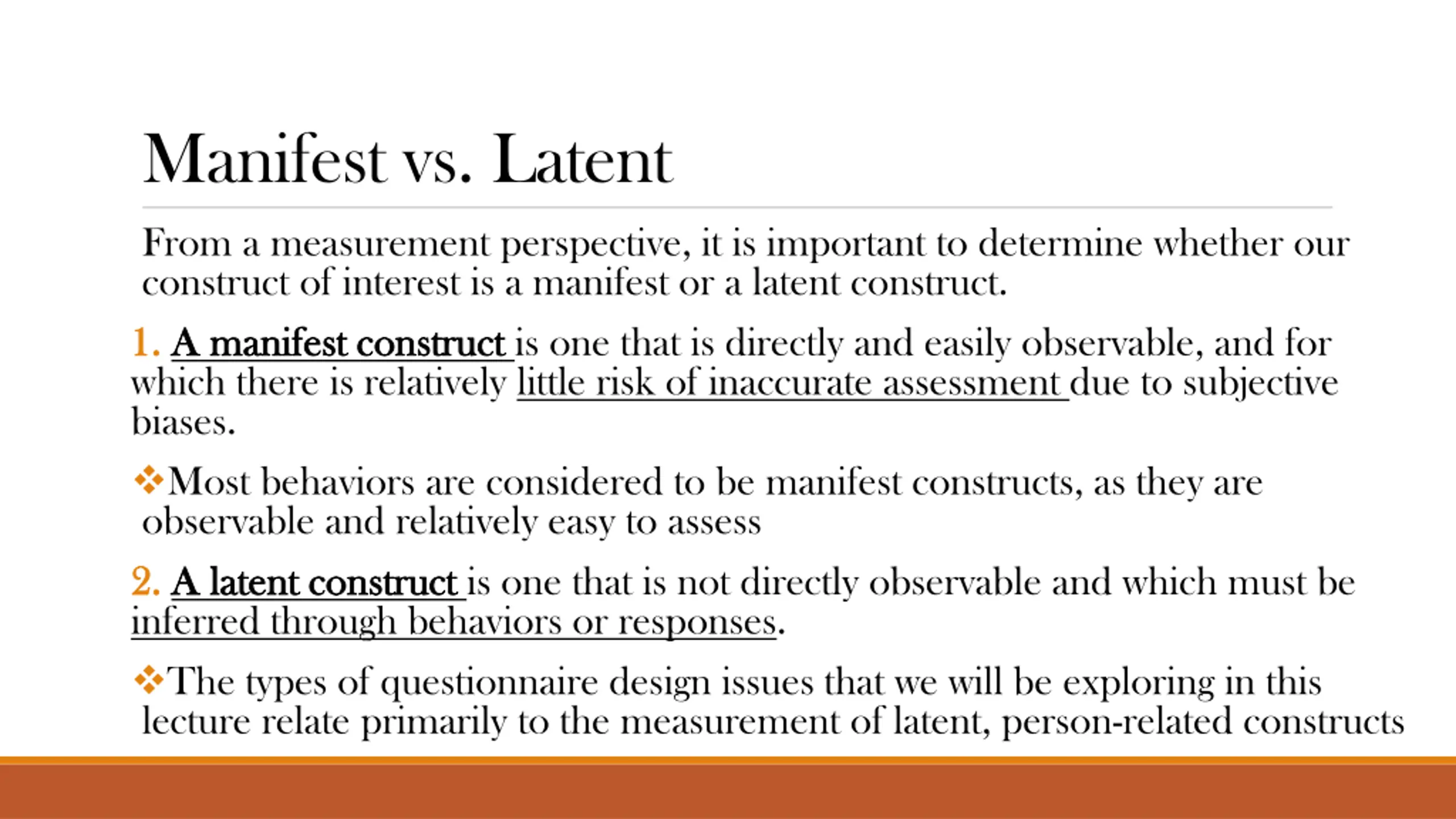 Manifest vs. Latent From a measurement perspective, it is important to determine whether our construct of interest is a manifest or a latent construct. 1. 1. A A manifest construct manifest construct is one that is directly and easily observable, and for which there is relatively little risk of inaccurate assessment due to subjective biases. Most behaviors are considered to be manifest constructs, as they are observable and relatively easy to assess 2. 2. A A latent construct latent construct is one that is not directly observable and which must be inferred through behaviors or responses. The types of questionnaire design issues that we will be exploring in this lecture relate primarily to the measurement of latent, person-related constructs