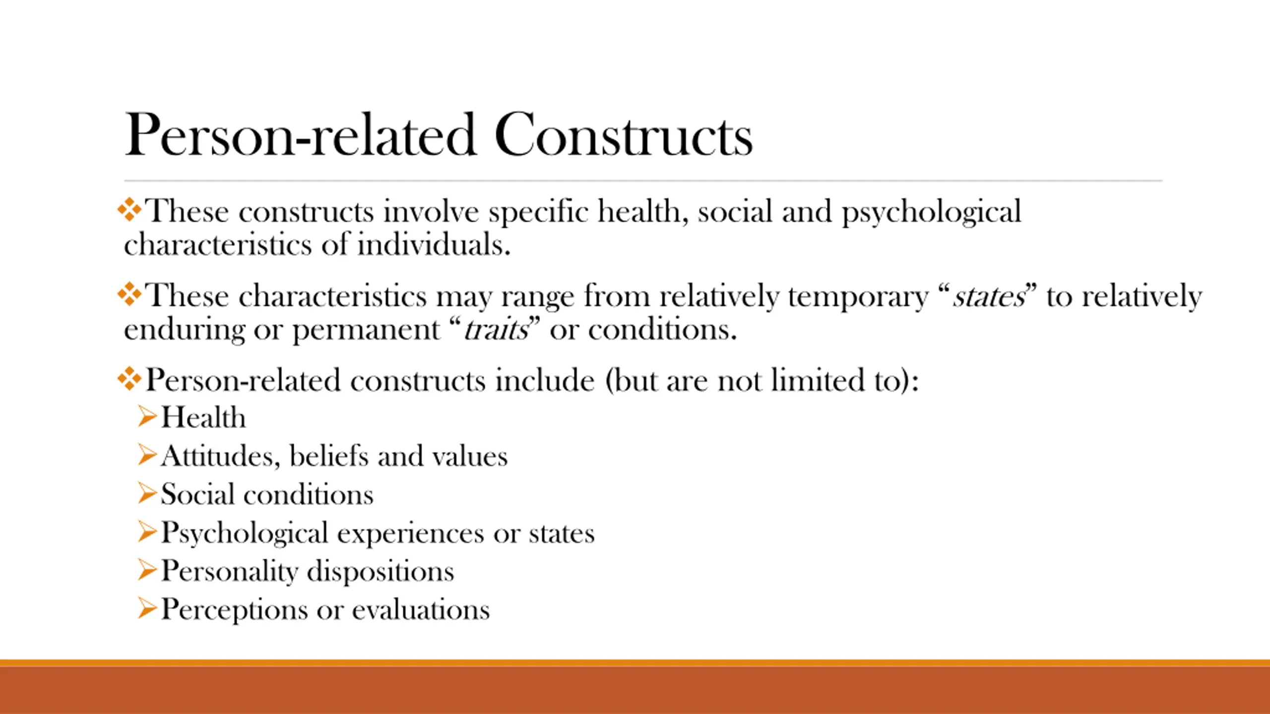 Person-related Constructs These constructs involve specific health, social and psychological characteristics of individuals. These characteristics may range from relatively temporary states to relatively enduring or permanent traits or conditions. Person-related constructs include (but are not limited to): Health Attitudes, beliefs and values Social conditions Psychological experiences or states Personality dispositions Perceptions or evaluations