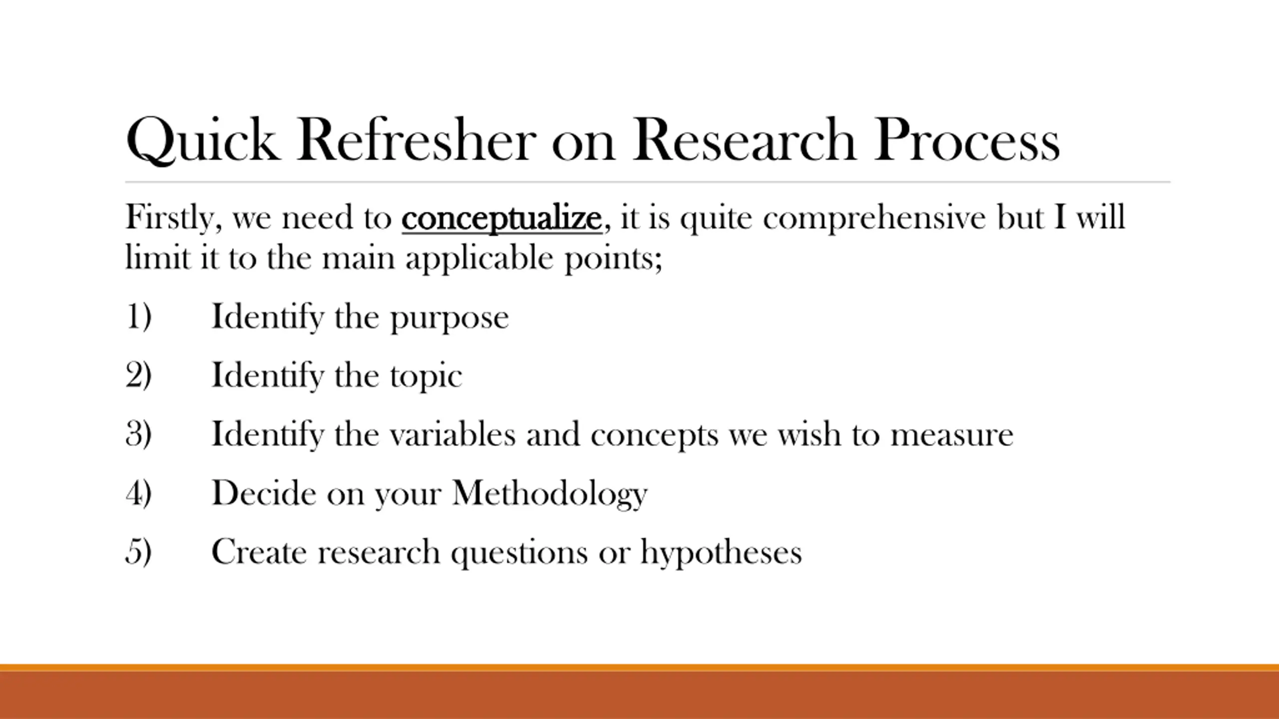 Quick Refresher on Research Process Firstly, we need to conceptualize limit it to the main applicable points; conceptualize, it is quite comprehensive but I will 1) Identify the purpose 2) Identify the topic 3) Identify the variables and concepts we wish to measure 4) Decide on your Methodology 5) Create research questions or hypotheses