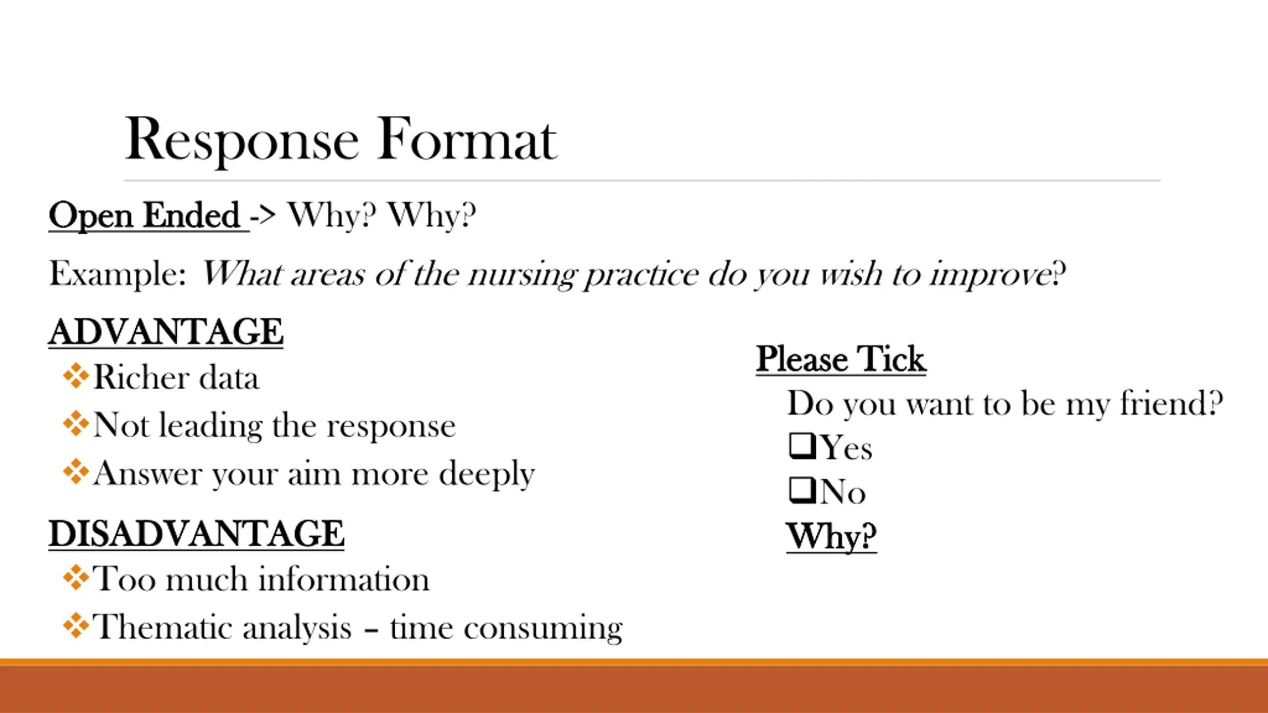 Response Format Open Ended Open Ended -> Why? Why? Example: What areas of the nursing practice do you wish to improve? ADVANTAGE ADVANTAGE Richer data Not leading the response Answer your aim more deeply Please Please Tick Do you want to be my friend? Yes No Why? Why? Tick DISADVANTAGE DISADVANTAGE Too much information Thematic analysis time consuming