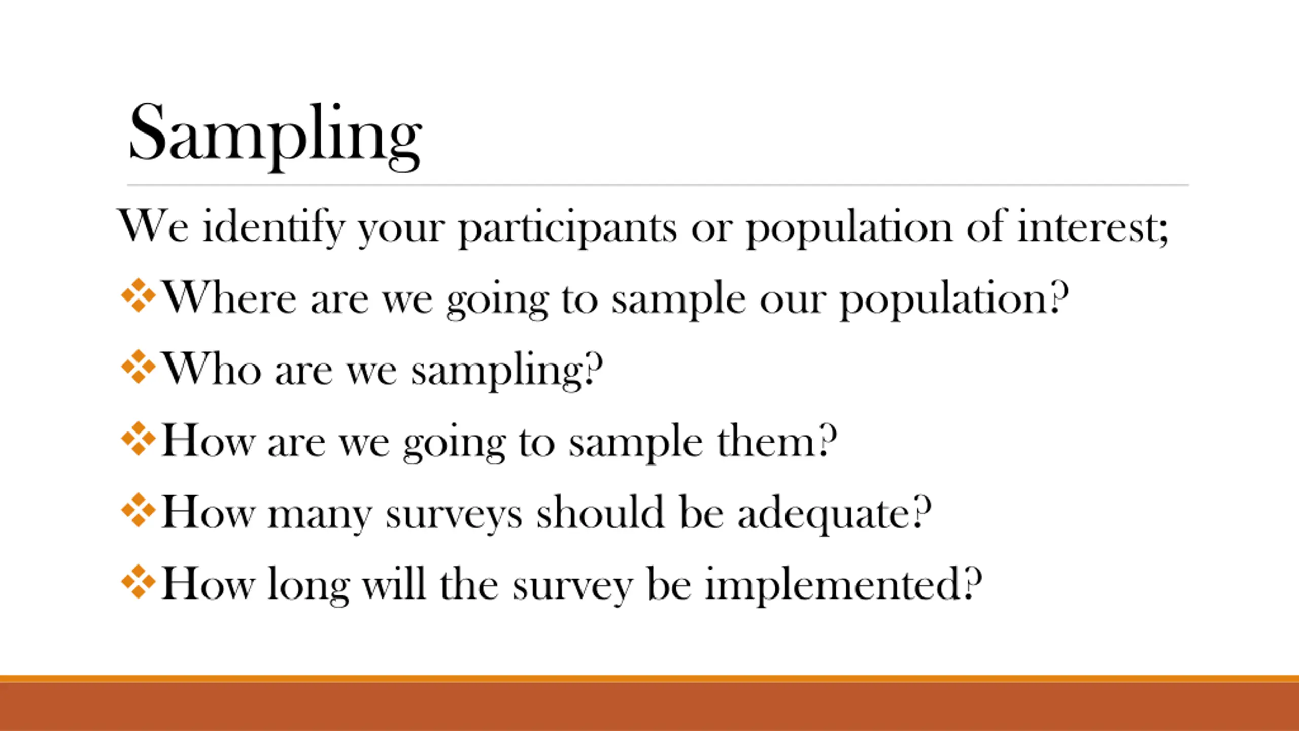 Sampling We identify your participants or population of interest; Where are we going to sample our population? Who are we sampling? How are we going to sample them? How many surveys should be adequate? How long will the survey be implemented?