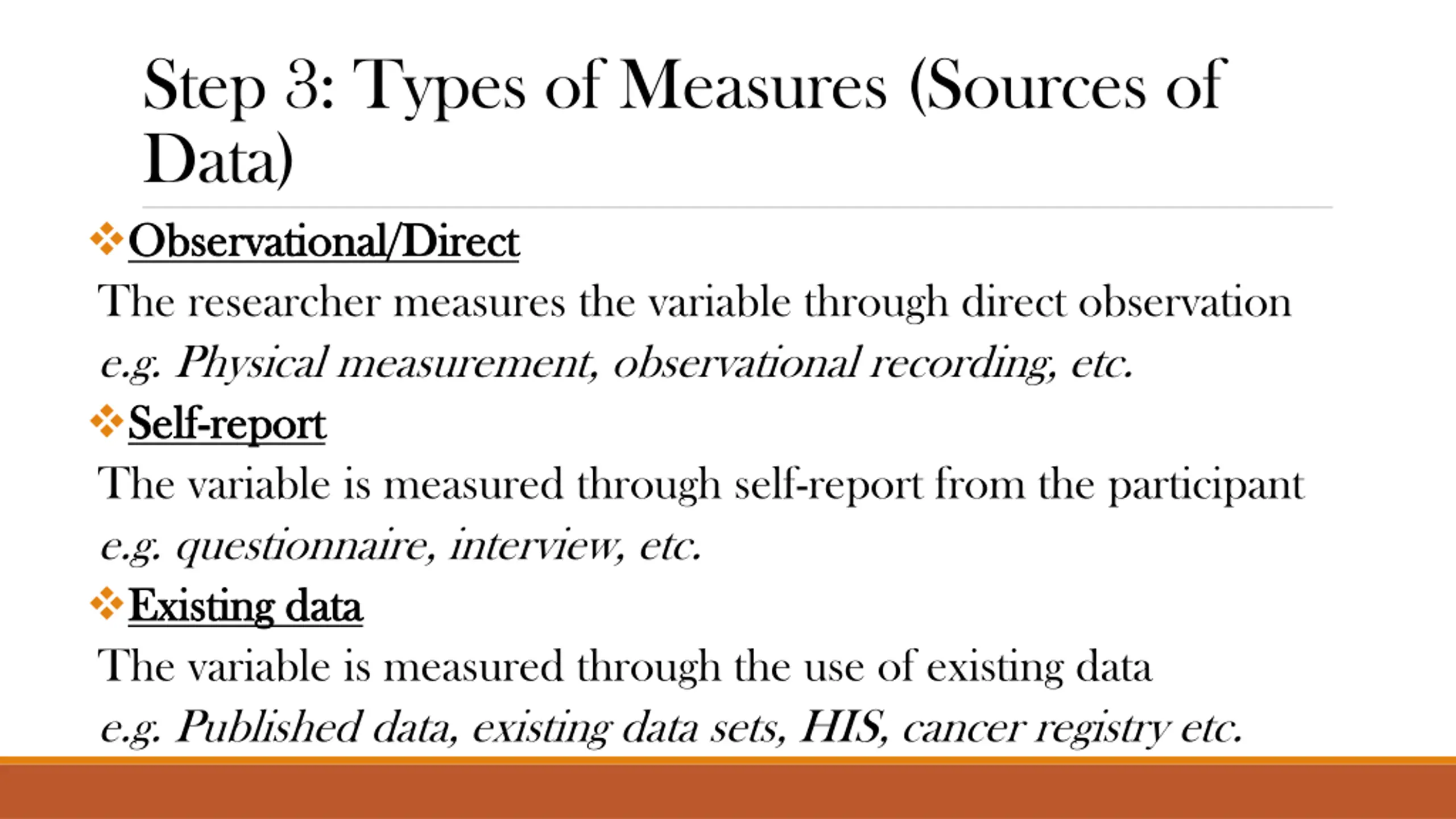 Step 3: Types of Measures (Sources of Data) Observational/Direct Observational/Direct The researcher measures the variable through direct observation e.g. Physical measurement, observational recording, etc. Self Self- -report report The variable is measured through self-report from the participant e.g. questionnaire, interview, etc. Existing Existing data data The variable is measured through the use of existing data e.g. Published data, existing data sets, HIS, cancer registry etc.