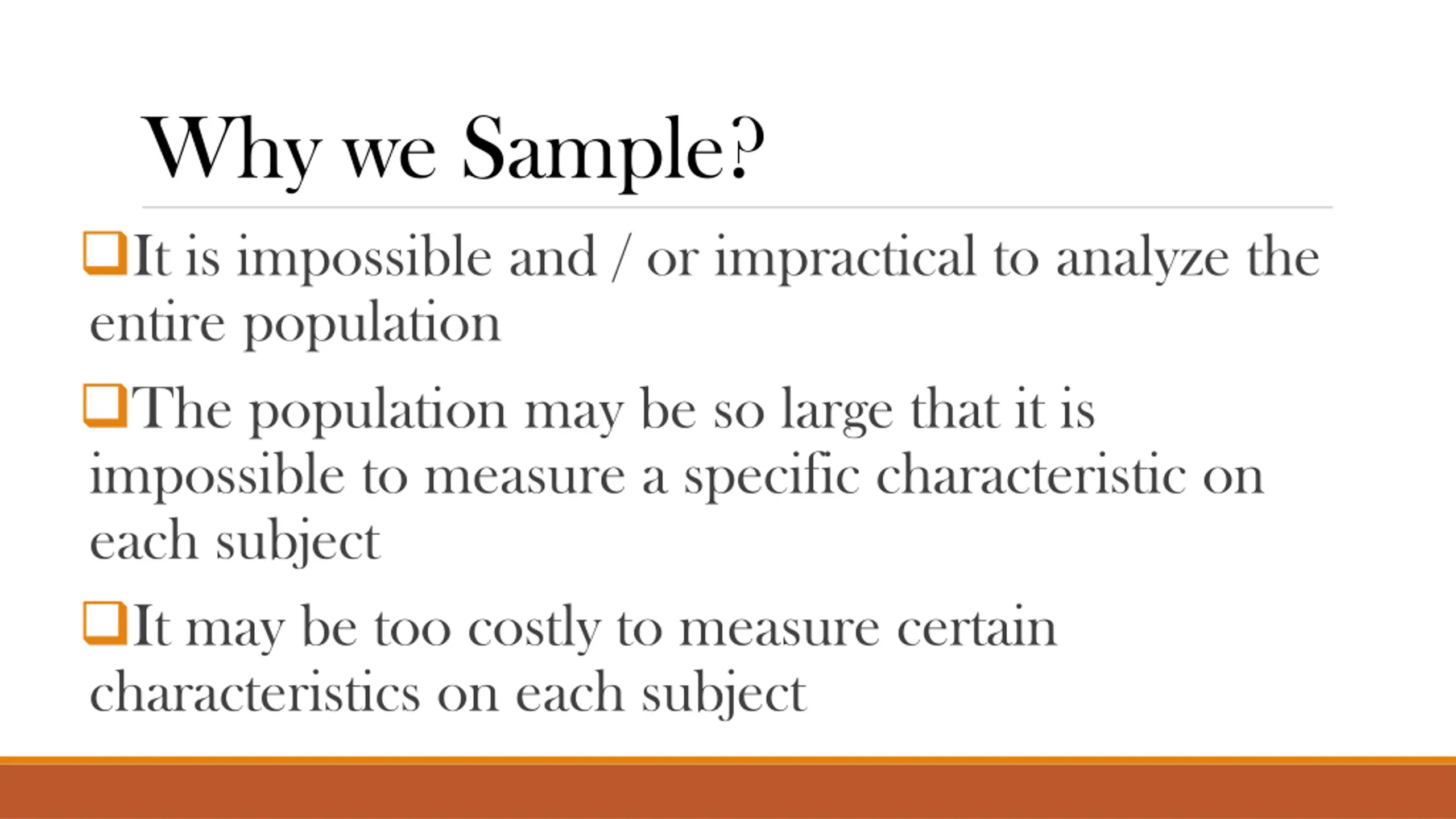 Why we Sample? It is impossible and / or impractical to analyze the entire population The population may be so large that it is impossible to measure a specific characteristic on each subject It may be too costly to measure certain characteristics on each subject
